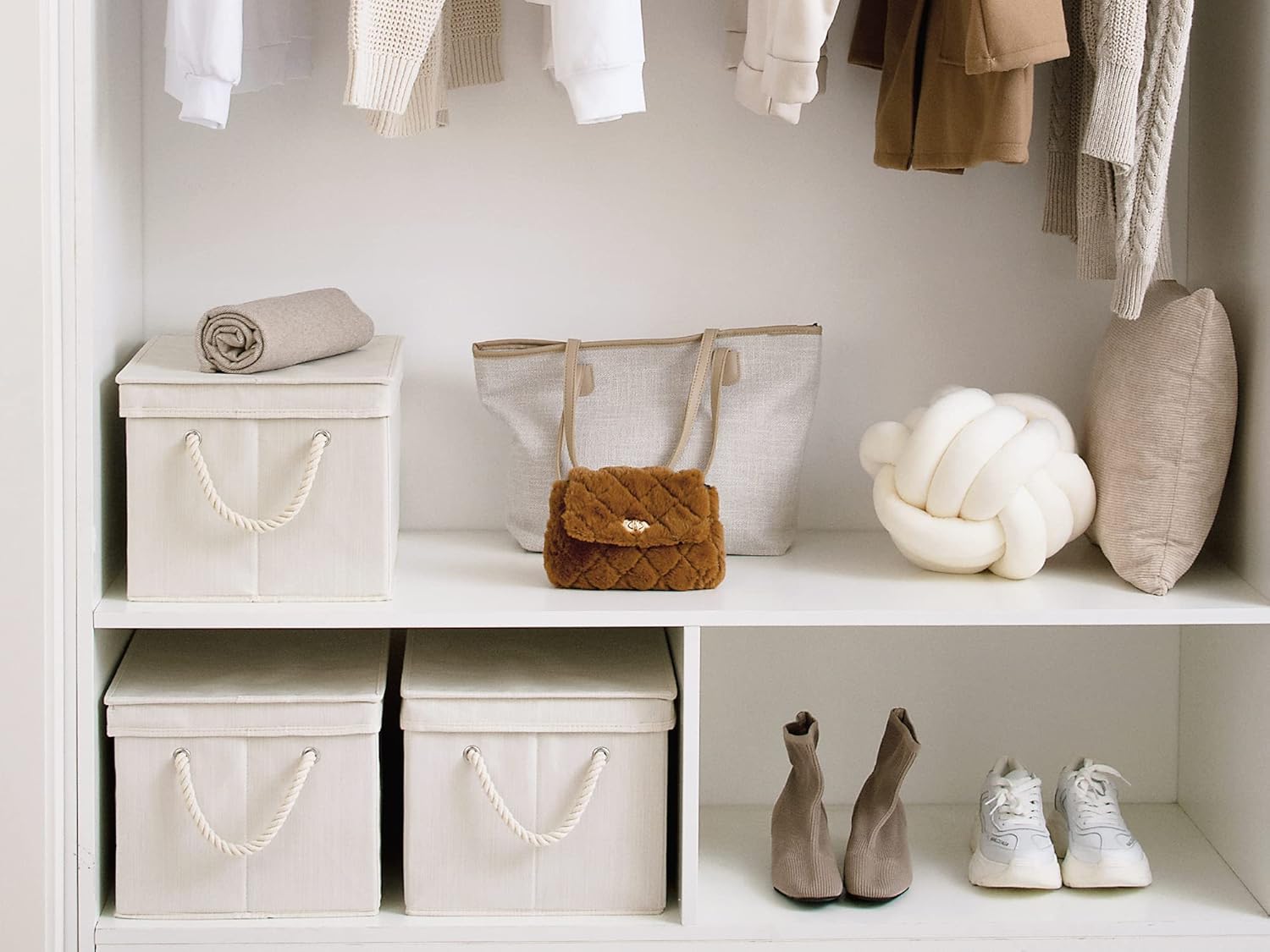- Thick fabric storage boxes with lids reinforced with heavy-duty boards.