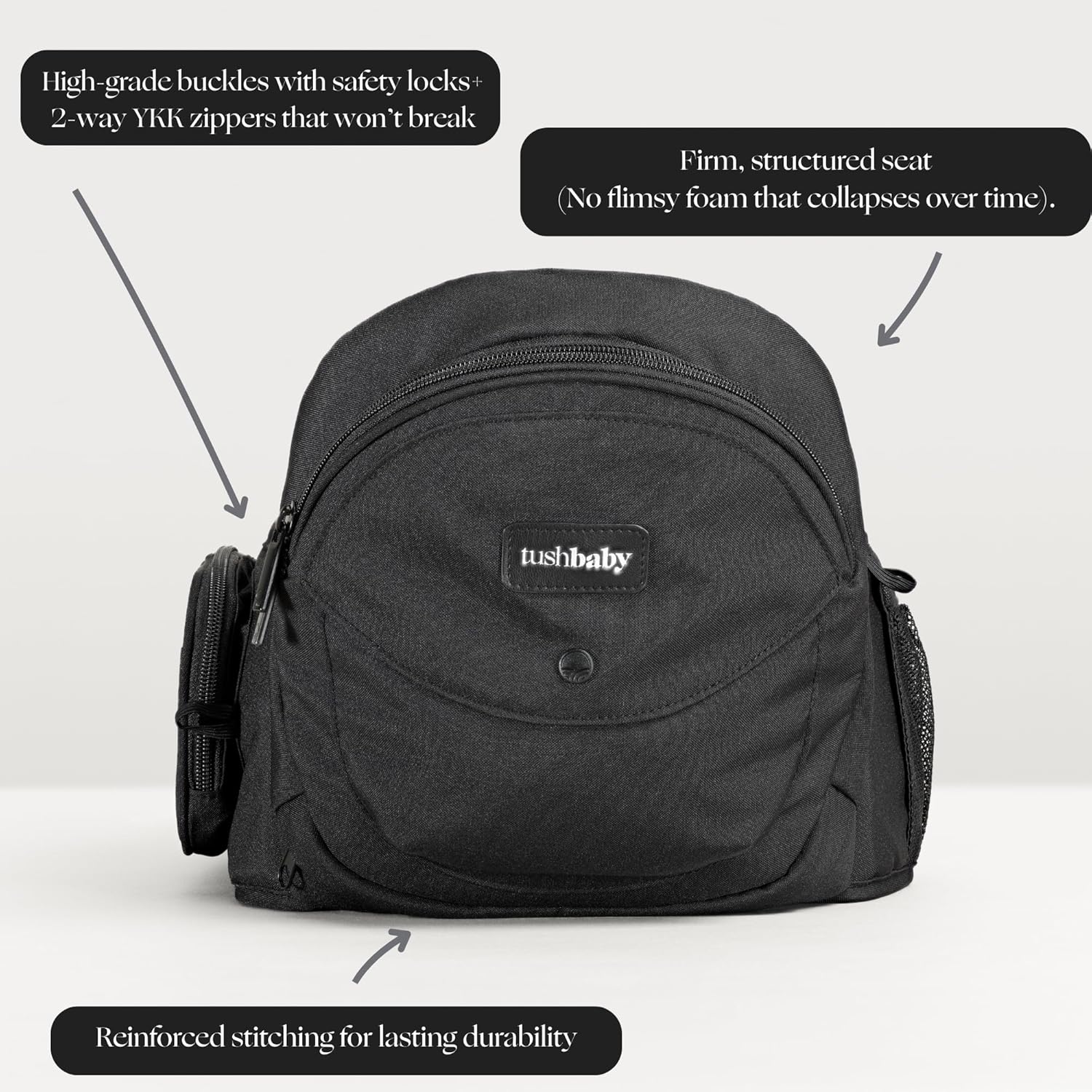 - FOUR CARRY POSITIONS, ENDLESS COMFORT: The Tushbaby carrier offers four versatile carry positions: face-to-face, front-facing, side carry, and feeding support. This means you can easily adapt to your baby's needs as they grow! Wearing it high and tight above your waist ensures comfort for both you and your little one. It’s a must-have for any parent on the go! Check out our Hip Seat Hands-Free Attachment that even makes the Hip Carrier hands free! (sold separately)