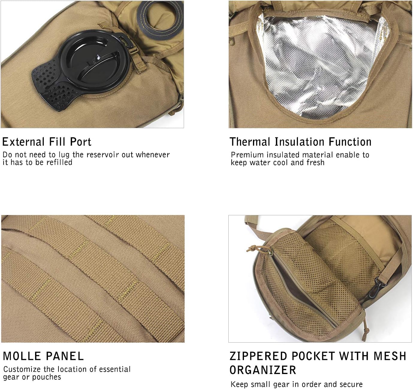 - THERMAL INSULATION COMPARTMENT: Adopted tough 1050D nylon material in main areas, it is ripstop, scratch-resistant, durable and will last a lifetime! Thermal insulation function in bladder compartment keeps you drinking cool and fresh water on your trail. External Fill Port with Integral Refill Handle is prefect for people who do not want to lug the reservoir out whenever it has to be refilled.