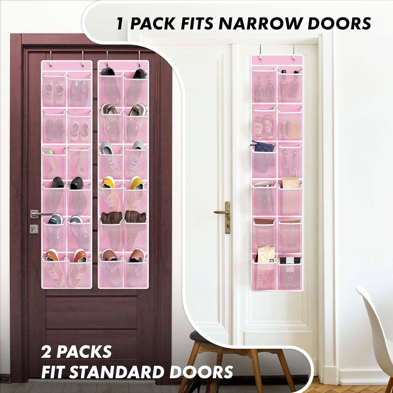 - 2-Pack, 12 Large Pockets: Includes 2 over-the-door organizers, each with 12 large 6" x 8" mesh pockets; ideal for shoes, accessories, cleaning supplies, and more