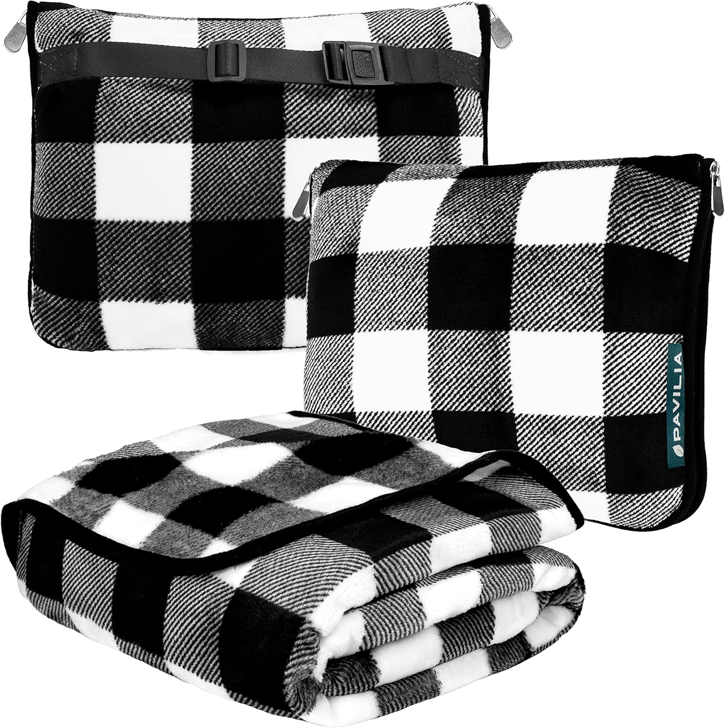 PAVILIA Travel Blanket Pillow, Soft Airplane Blanket 2-in-1 Combo Set, Plane Blanket Compact Packable, Flight Essentials Car Pillow, Travelers Gifts Accessories, Backpack Strap, 60x43 Checker White