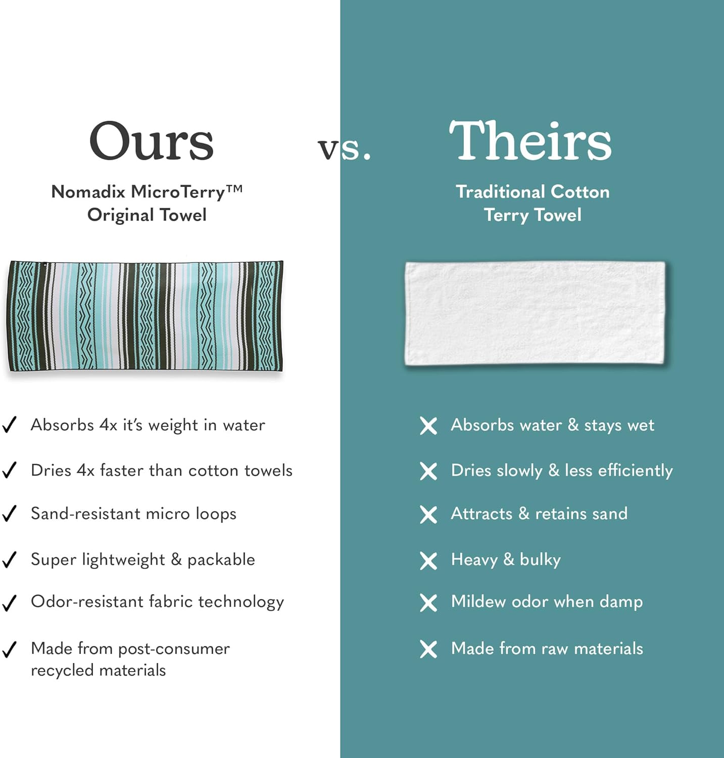 - Made With Post-Consumer Recycled Materials: We aren't using virgin plastic to make our products. We source already used plastics to build our towels.