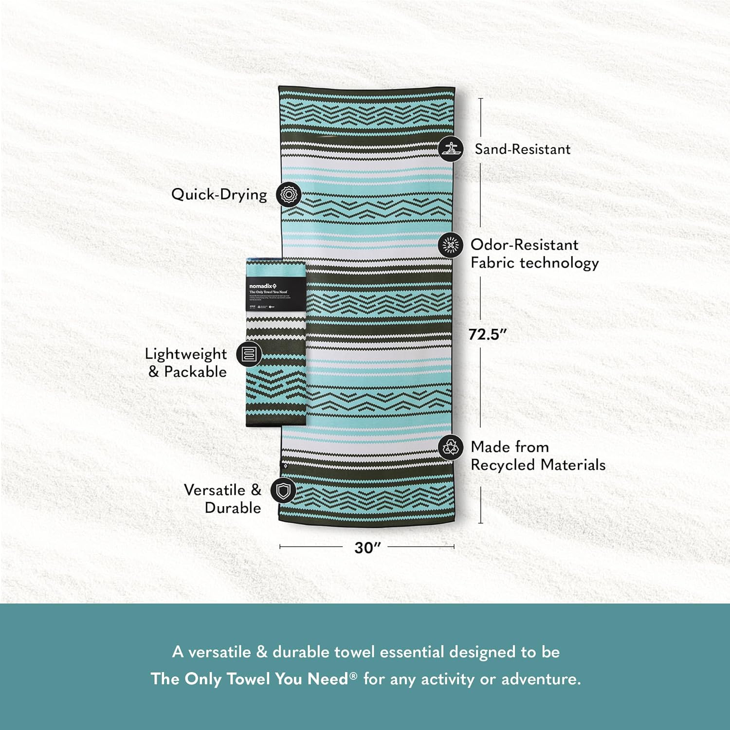 Nomadix Original Towel - Perfect for Beach, Pool, Travel, Camping, Yoga - Made with Recycled Materials - Super Absorbent - Sand Resistant - Baja Aqua - 72.5x30