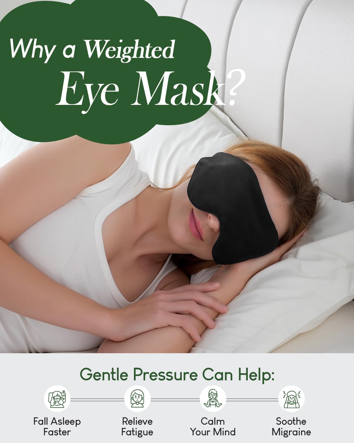 - Fall Asleep Faster: Our weighted eye mask, filled with glass microbeads, features a compartmental design that ensures balanced pressure, molding around your eyes. Great for helping you fall asleep, alleviating fatigue, calming the mind, or easing headaches.
