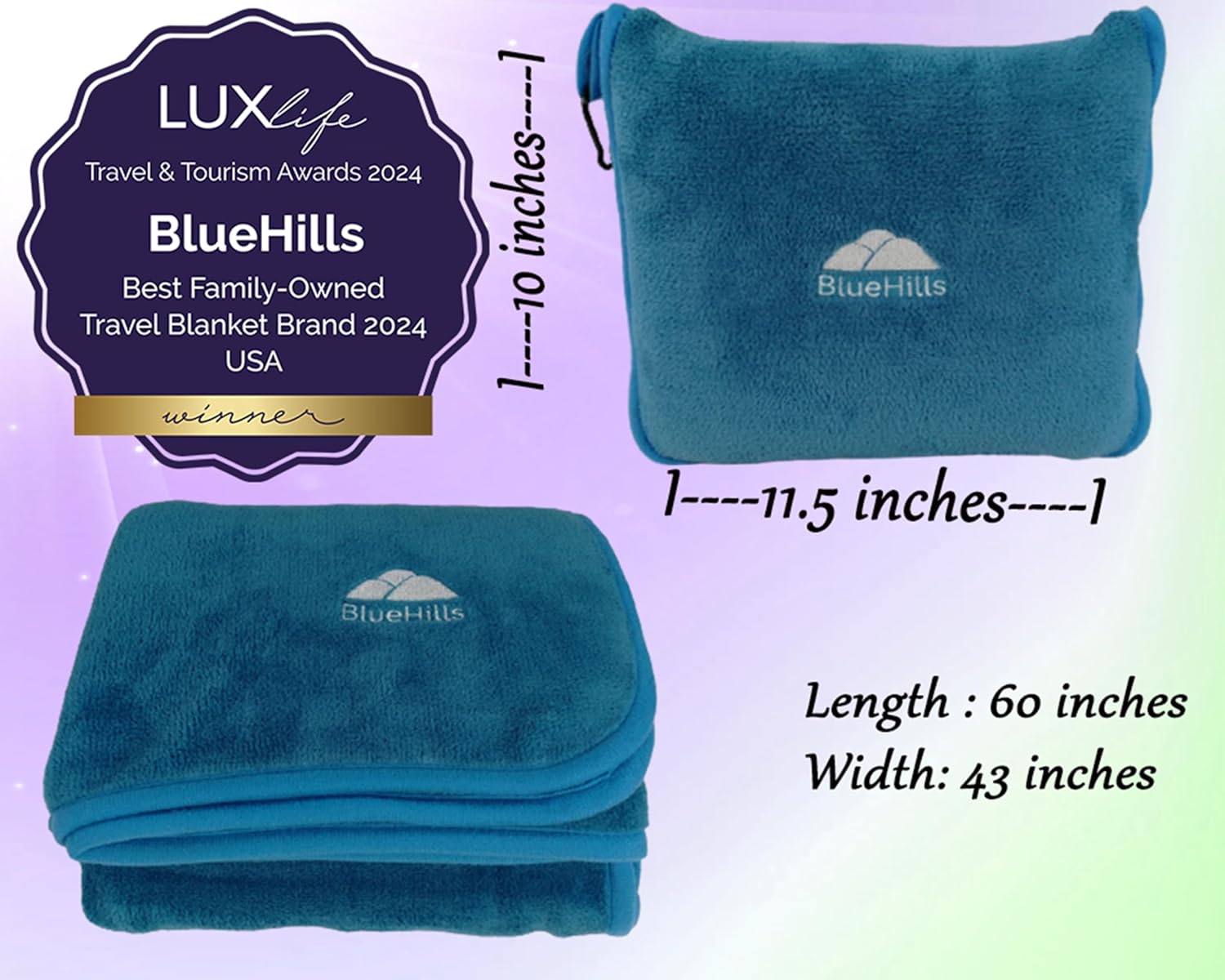 BlueHills Premium Soft Travel Blanket Pillow Airplane Blanket in Soft Bag case with Hand Luggage Belt and Carabiner Compact Pack Large Cozy Plane Car Train Teal Blue T022
