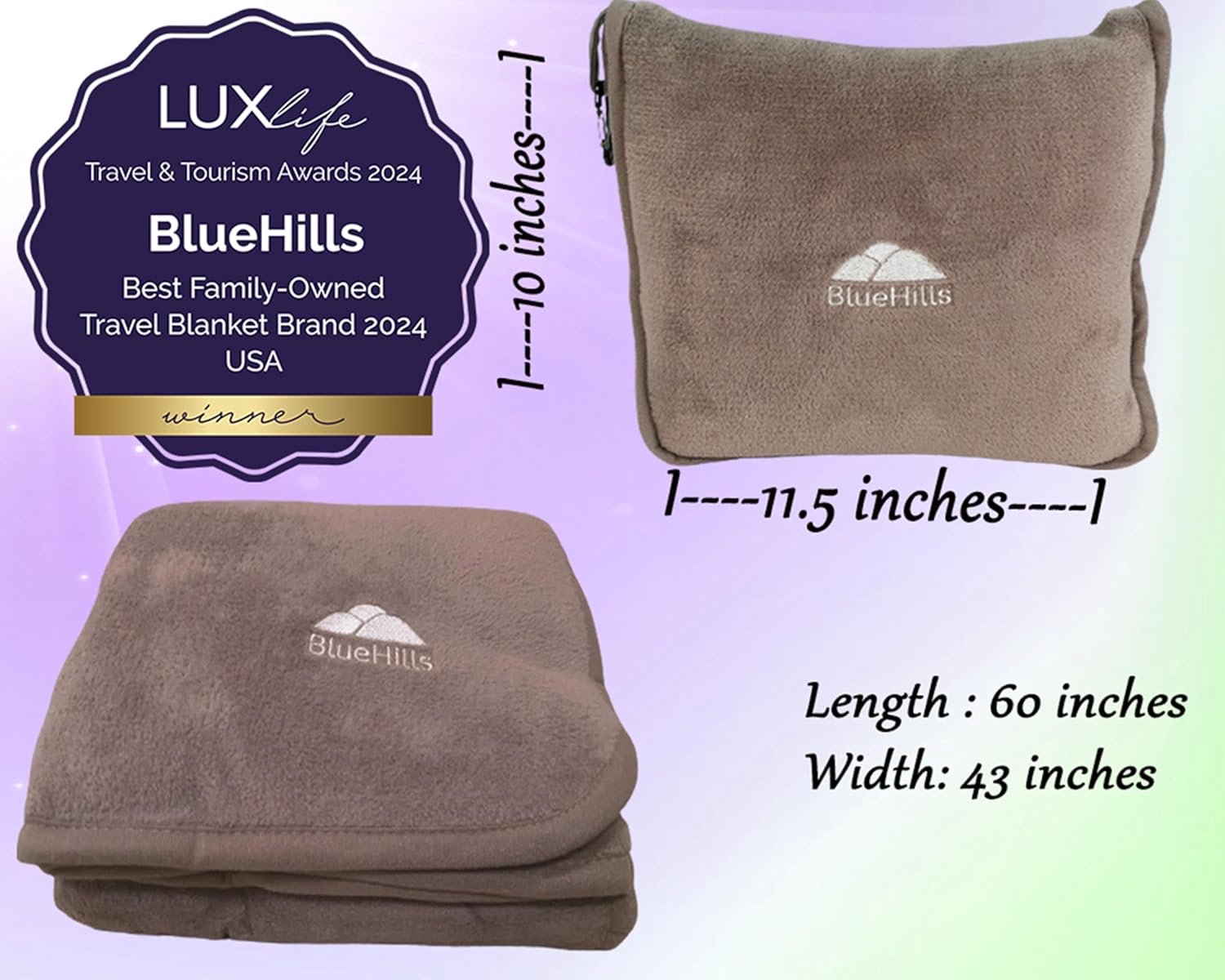 BlueHills Premium Soft Travel Blanket Pillow Airplane Flight Blanket Throw in Soft Bag Pillow case with Luggage Belt & Backpack Clip Compact Pack Large Airport Taupe T023