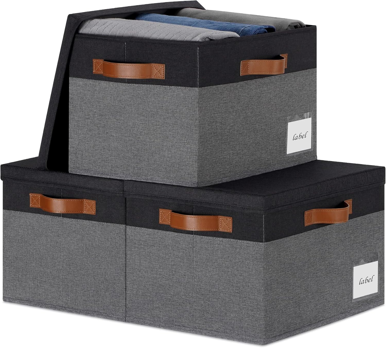Large Storage Bins with Lids, Foldable Fabric Storage Baskets with Lids, Sturdy Storage Boxes with Labels and 3 PU Handles for Closet Home Bedroom Office (26L, 3 Packs, Grey&Black)
