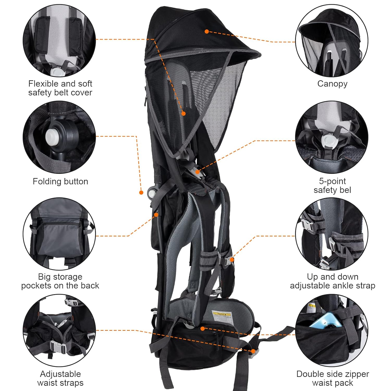 - [100 percent COMFORT & SAFETY]: Flexible shoulder straps of our hiking backpack carrier allow parents to carry their baby for long periods of time, and the wide padded and adjustable waist belt reduces the weight on your shoulders. the double side safety buckles, and double ankle straps that move up and down for enhanced carry protection.