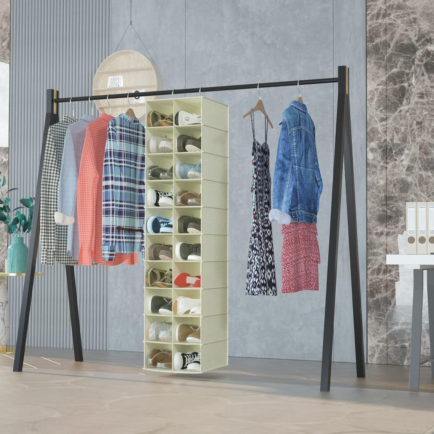 coastal rose Hanging Shoe Organizer for Closet, 20 Sections Hanging Closet Organizers and Storage Shelves, Space Saving Shoe Storage Rack Holder, Beige, 12''W×12''Dx 50''H