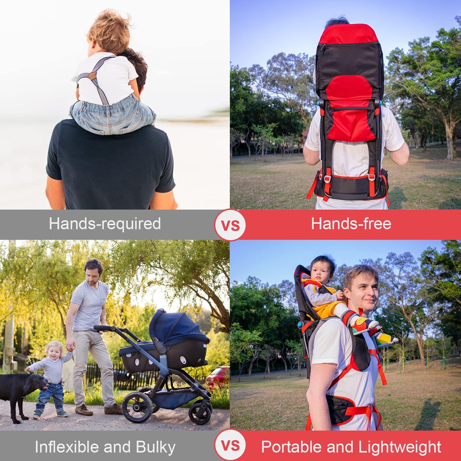 - [HAPPY BABY, HAPPY PARENTS]: We offer you only the best baby backpack carrier. This hands free design toddler carrier is not only versatile but also very comfortable for both you and your child. The baby sits comfortably on your shoulders and enjoys a higher perspective to observe everything around him.