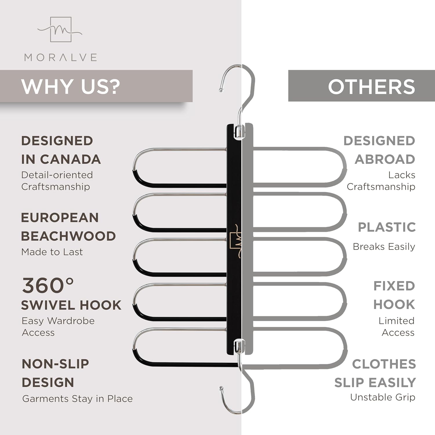 MORALVE Pants Hangers Space Saving - 2 Pack European Beechwood Scarf and Jean Hangers - Closet Organizer and Space Saver Pant Rack, Leggings Hanger, and Scarf Holder with 360° Swivel Hook