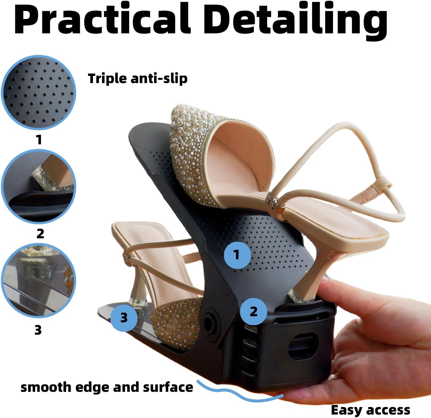 - Four-POSITION FLEXIBLE ADJUSTABLE - Adjustable heights from 2.7'', 4.3'', 6.4'' to 7.2'', perfect for all kinds of shoes, whether it's flat shoes or high heels (the size should bellow 9). With a fine size design, you don't have to worry about the shoes being squeezed