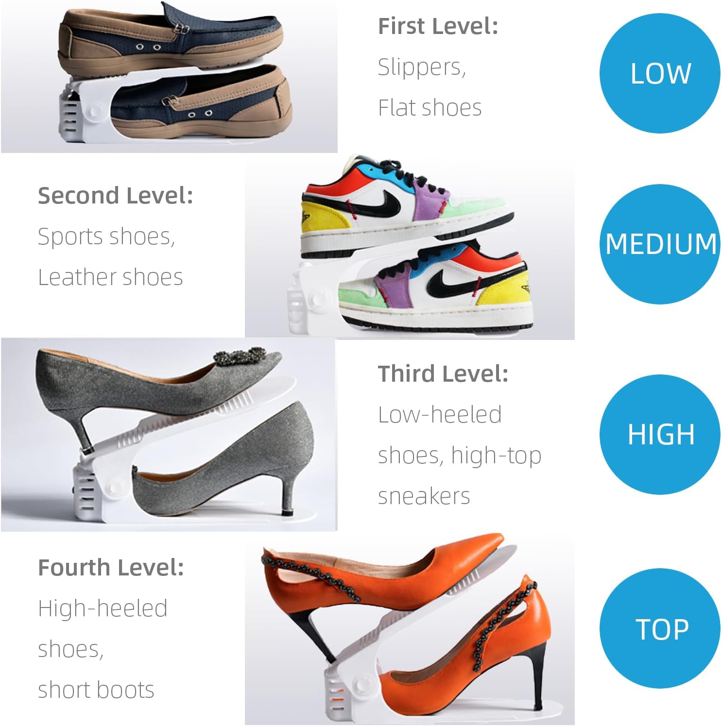 - Four-POSITION FLEXIBLE ADJUSTABLE - Adjustable heights from 2.7'', 4.3'', 6.4'' to 7.2'', perfect for all kinds of shoes, whether it's flat shoes or high heels (the size should bellow 9). With a fine size design, you don't have to worry about the shoes being squeezed