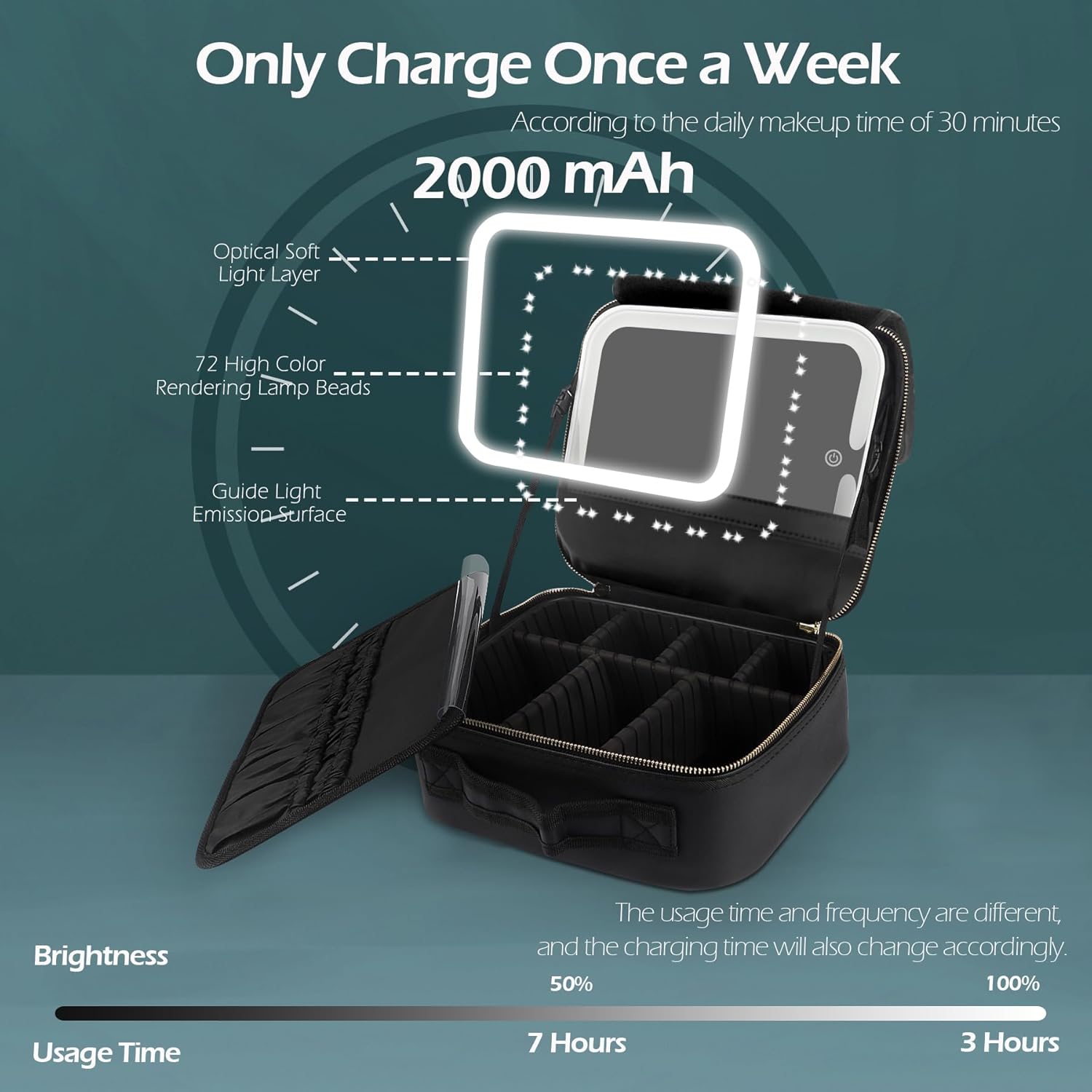 MOMIRA Travel Makeup Bag Cosmetic Bag with Lighted Mirror, Adjustable Brightness in 3 Color Scenarios, Waterproof, 10x Magnifying Mirror, Rotatable Independent Light Mirror- Black(Solid)