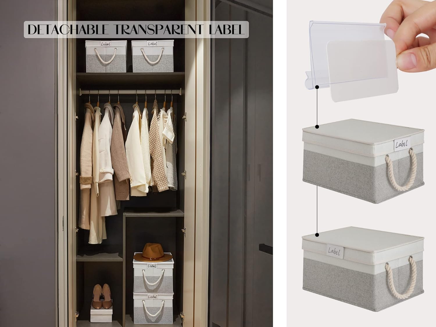- DETACHABLE TRANSPARENT LABEL: Easy to remark and identify the items in the stackable storage baskets with lids, feel free to hang it on the front or side of the fabric storage bins with lids, made of transparent vinyl which is dustproof.