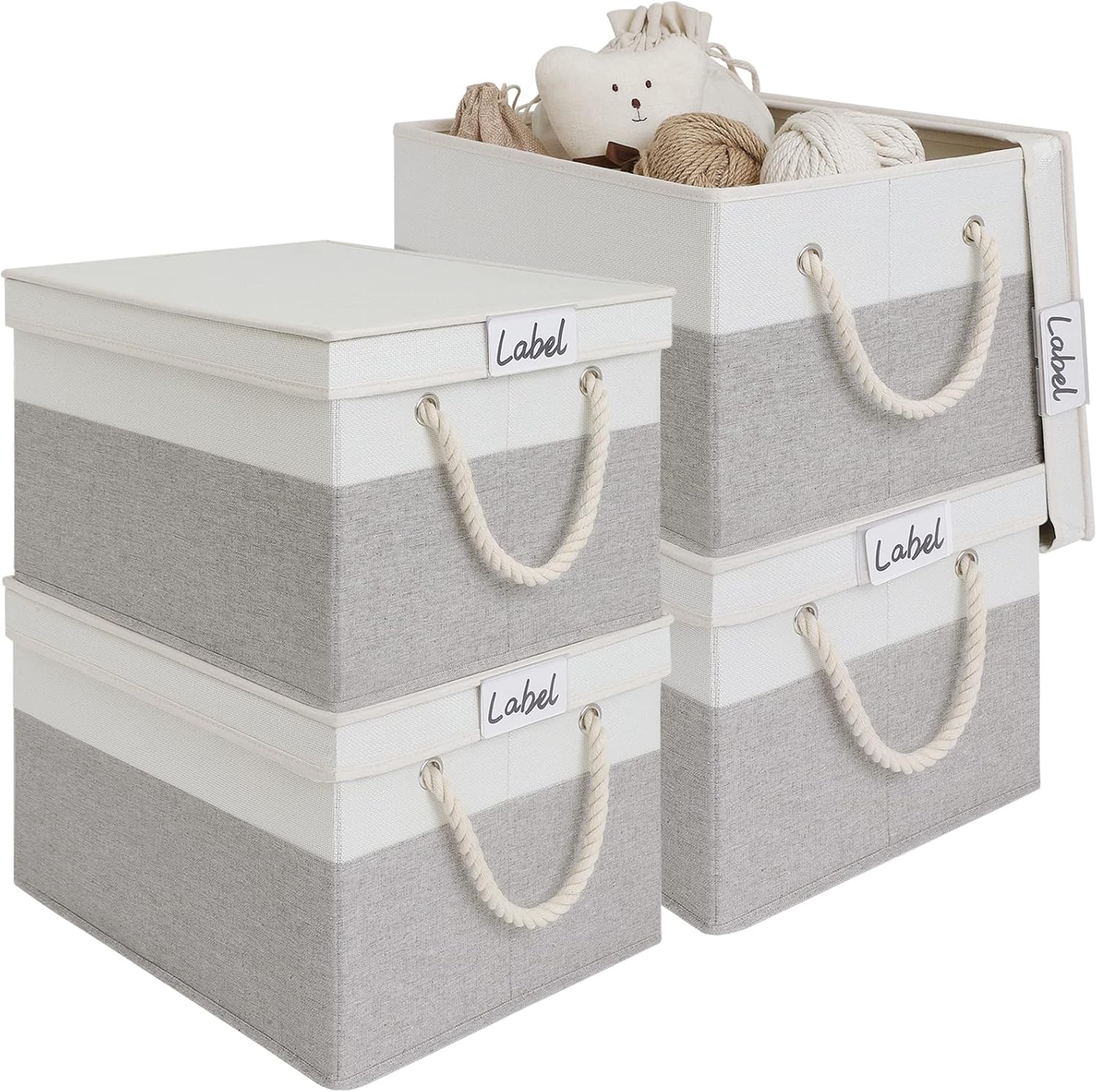 LoforHoney Home Fabric Storage Bins with Lids for Organizing, Foldable Closet Storage Boxes for Shelves, Clothes Baskets with Cotton Rope Handles, XLarge, Beige & Gray, 4-Pack