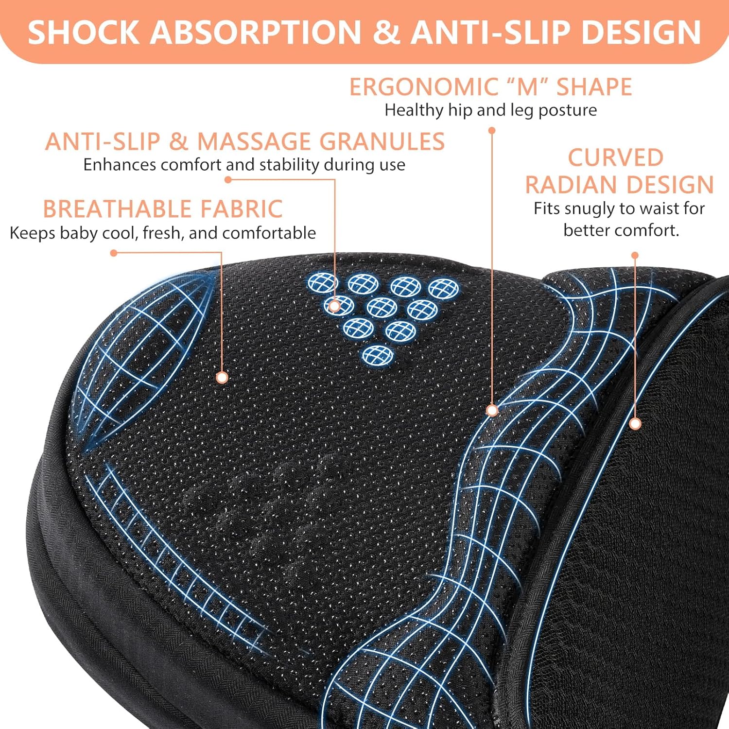 - Ergonomic Design for Baby’s Comfort: Non-slip, shock-absorbing hip seat maintains baby’s hips in an ergonomic "M" position; a 30-degree angled seat brings the baby closer to the parent, ensuring a secure and comfortable carry