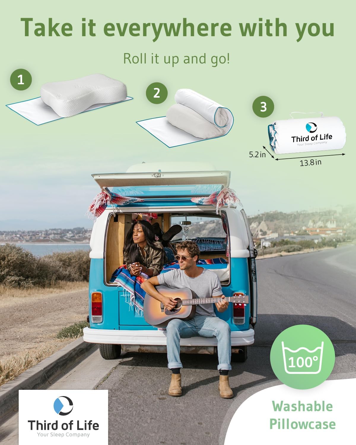 Third of Life Travel Pillow with Activated Charcoal Memory Foam | Cervical Neck Pain Relief Pillow for Back & Side Sleepers | Aloe Vera Extract Viscose Pillowcase