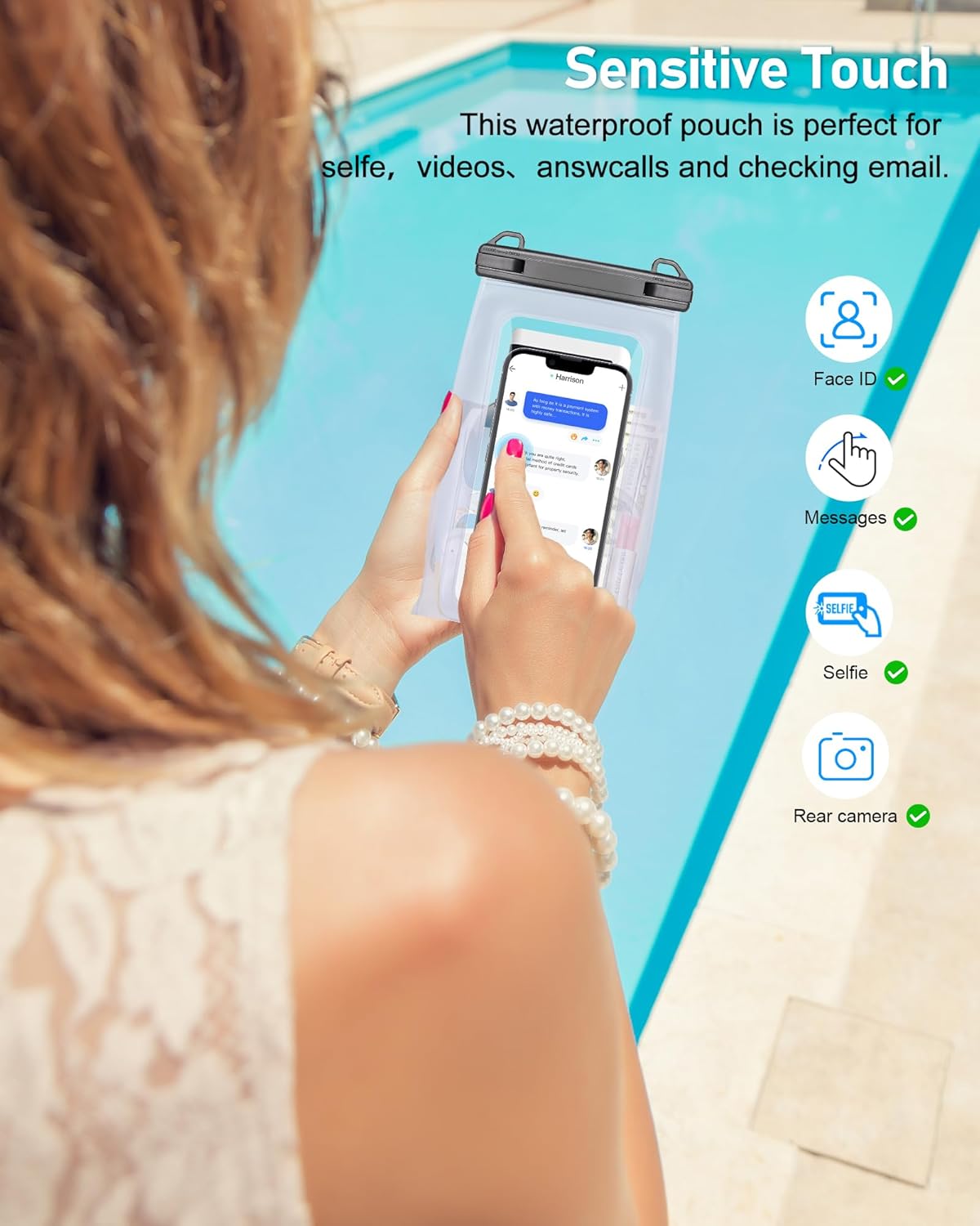 - Sensitive Touch Screen - The waterproof pouch is made of premium soft touch PVC materials, with excellent touch screen performance, allowing you to messages, make a call, watch videos, face recognition, and take selfies without taking out your phone of the pouch and surpport take photo by rear camera(Do not to let other stuff block the phone camera)