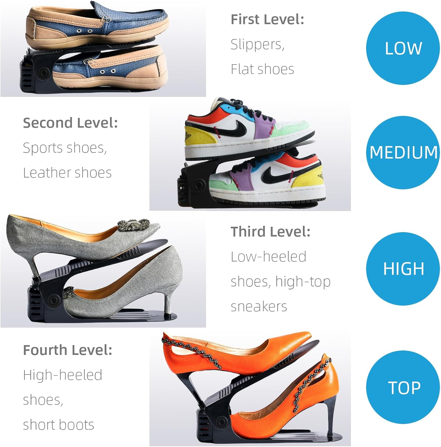 - Four-POSITION FLEXIBLE ADJUSTABLE - Adjustable heights from 2.7'', 4.3'', 6.4'' to 7.2'', perfect for all kinds of shoes, whether it's flat shoes or high heels (the size should bellow 9). With a fine size design, you don't have to worry about the shoes being squeezed