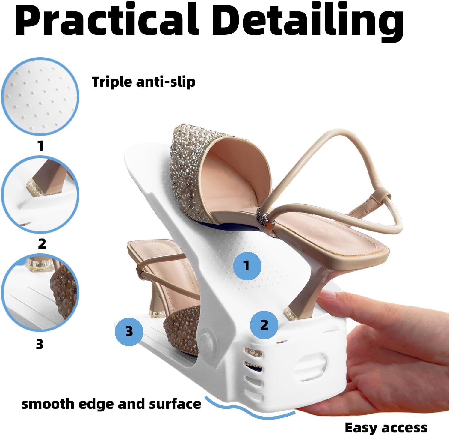 - Four-POSITION FLEXIBLE ADJUSTABLE - Adjustable heights from 2.7'', 4.3'', 6.4'' to 7.2'', perfect for all kinds of shoes, whether it's flat shoes or high heels (the size should bellow 9). With a fine size design, you don't have to worry about the shoes being squeezed