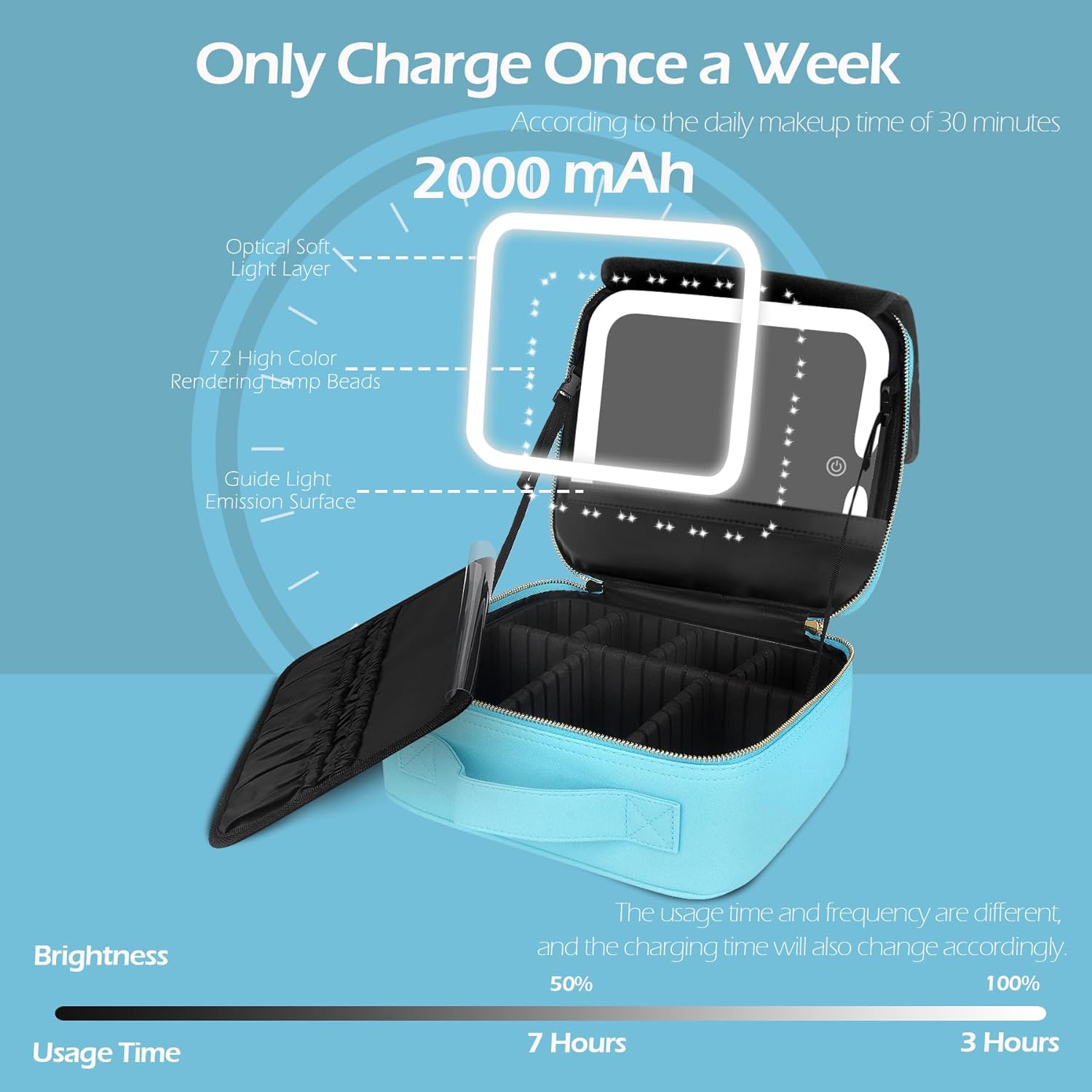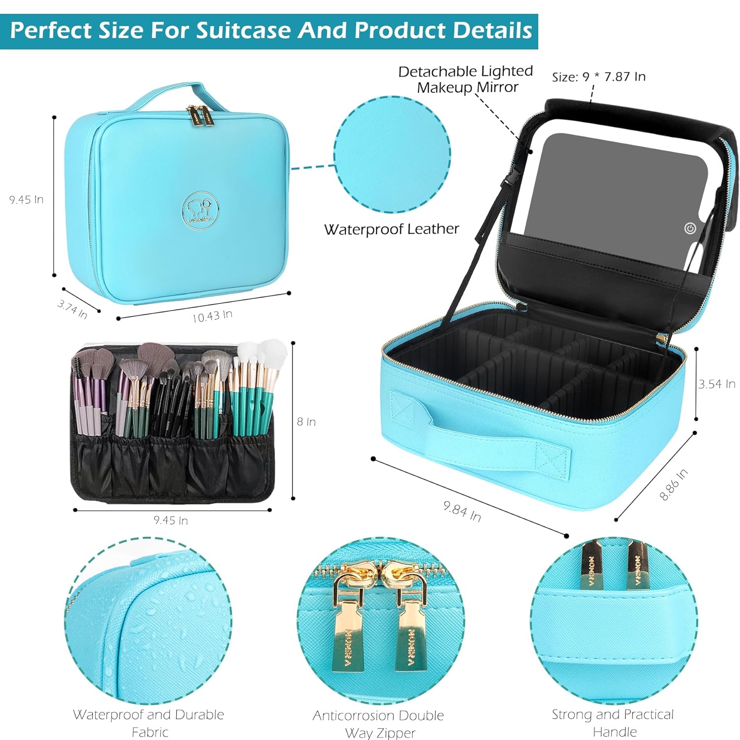 MOMIRA Travel Makeup Bag Cosmetic Bag with Lighted Mirror, Adjustable Brightness in 3 Color Scenarios, Waterproof, 10x Magnifying Mirror, Rotatable Independent Light Mirror- Diamond Blue(Solid)