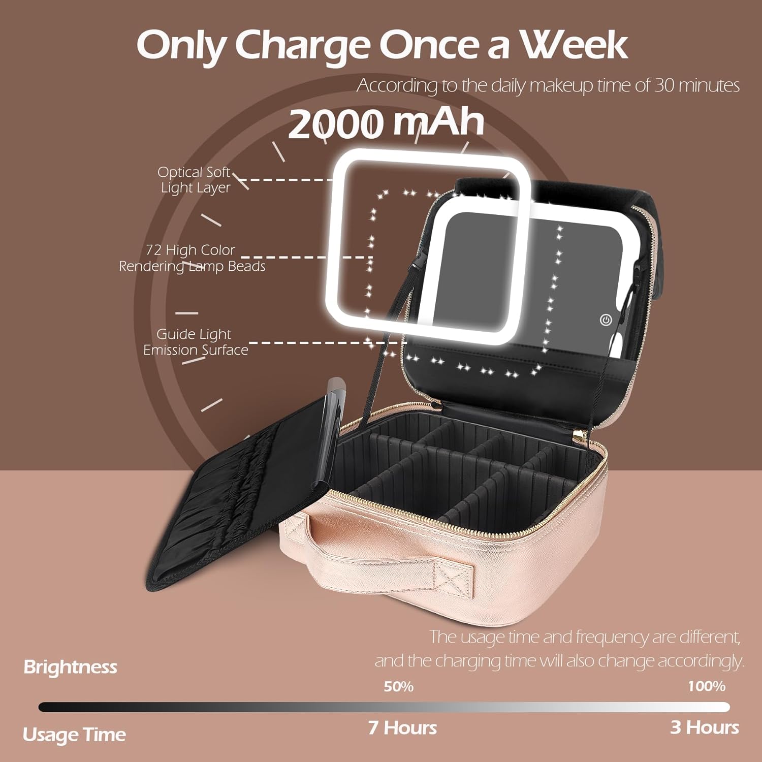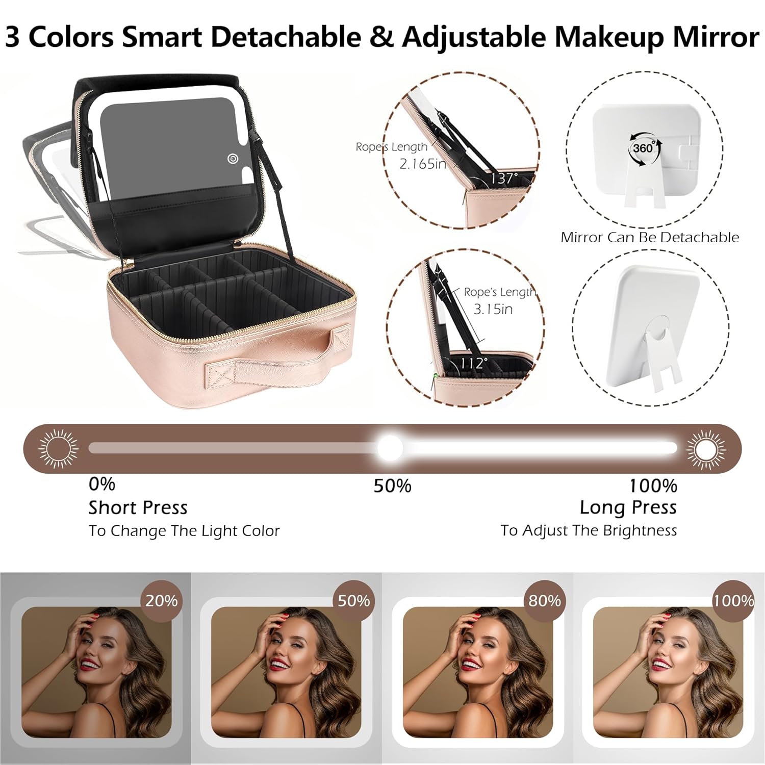 MOMIRA Travel Makeup Bag Cosmetic Bag Makeup Organizer Bag with Lighted Mirror, Adjustable Brightness in 3 Color Scenarios, Waterproof Makeup Train Case, Gift for Women - Champagne