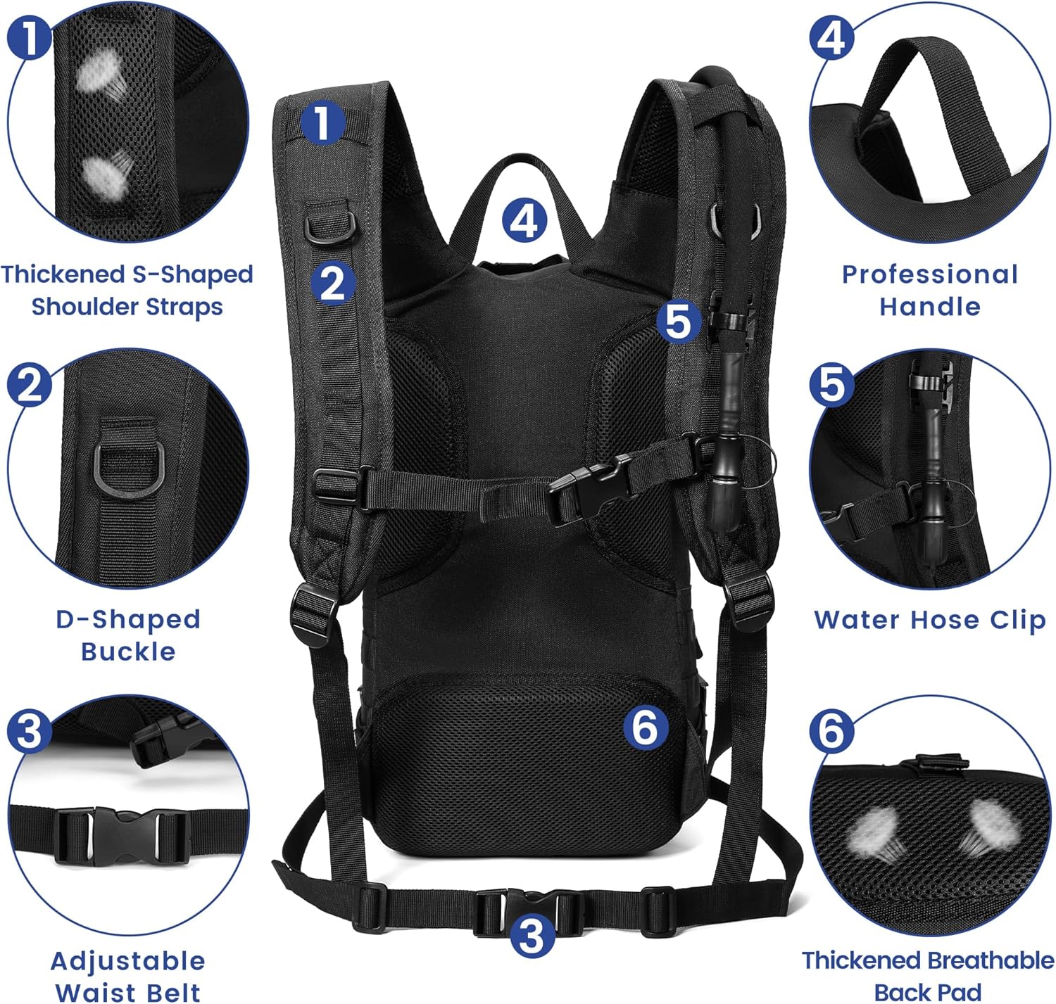 - Staying Hydrated at All Times: The water backpack is equipped with a 3L large capacity hydration bladder, and 3L of large capacity ensures enough water supply and is easy to use. the hydration bladder is made of food-grade BPA-free materials, which are safe and tasteless. After many tests, the hydration bladder is safe and leak-proof, and it is easy to replace