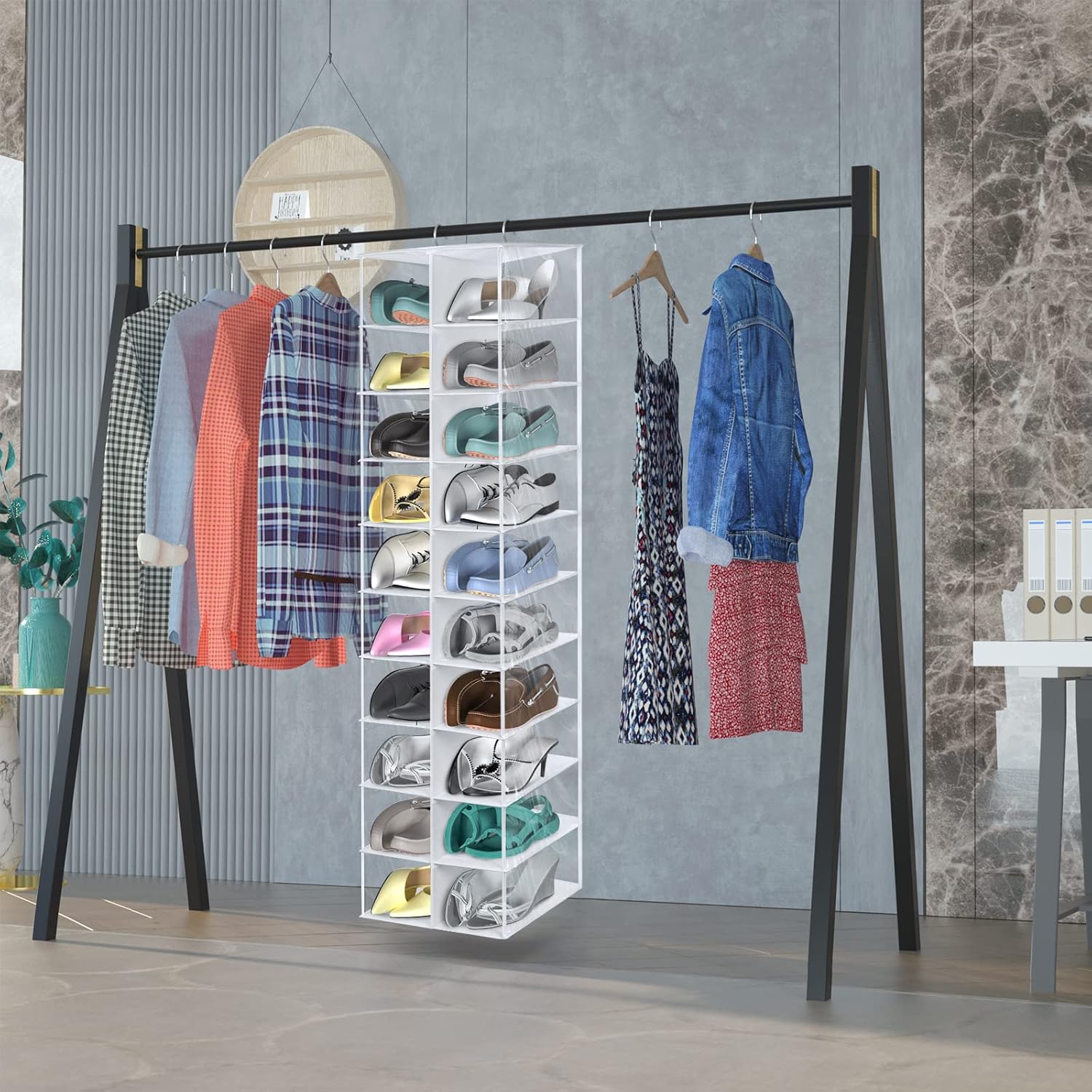 - 【Quick Installation】This shoe storage is easy to install, hang the stainless steel hook directly into the metal hole at the top of the shoe storage rack, metal hooks can hang from the closet rod or garment rack directly.