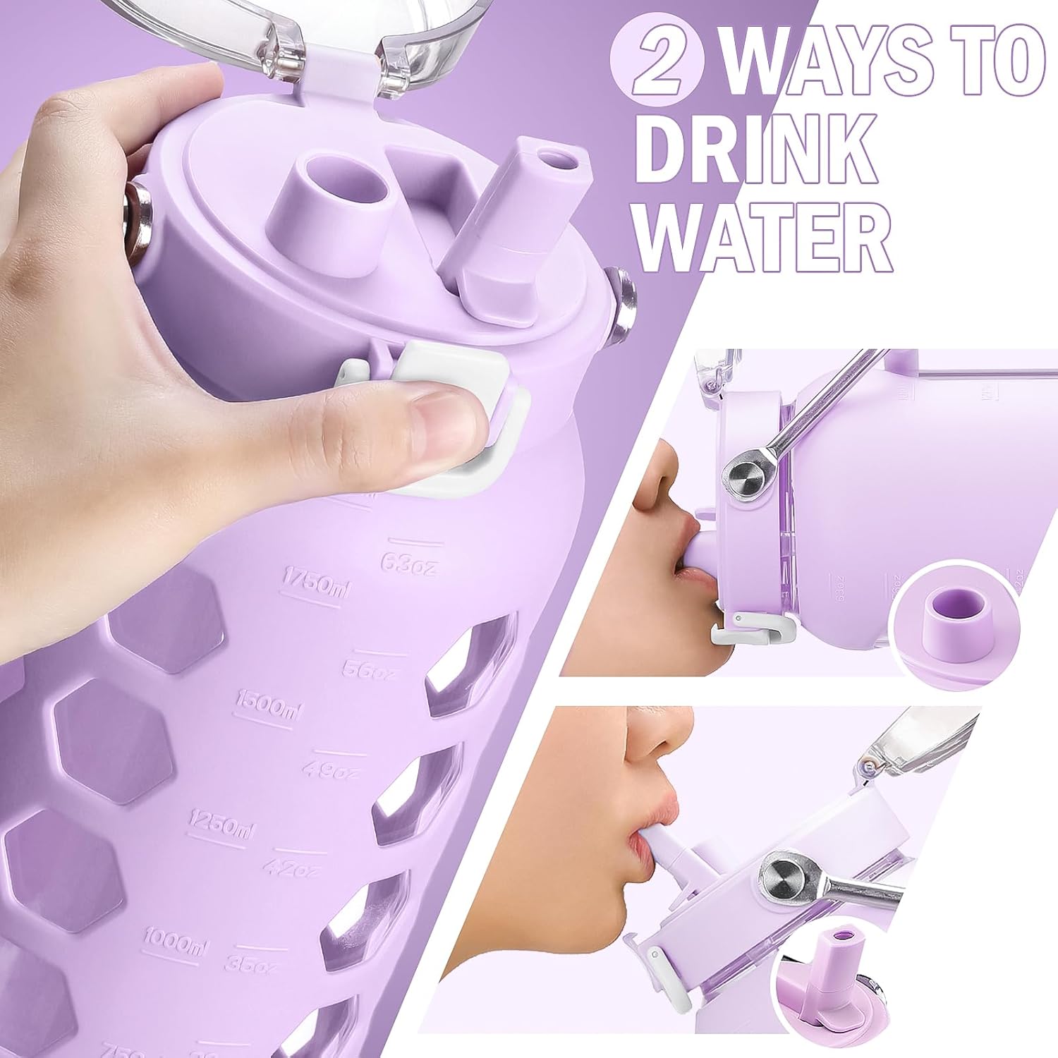 MUKOKO 64oz Glass Water Bottles with Straw and Lid,Half Gallon Water Bottle with Time Marker,Large Glass Water Jug with Silicone Sleeve and Stainless Steel Handle-Purple