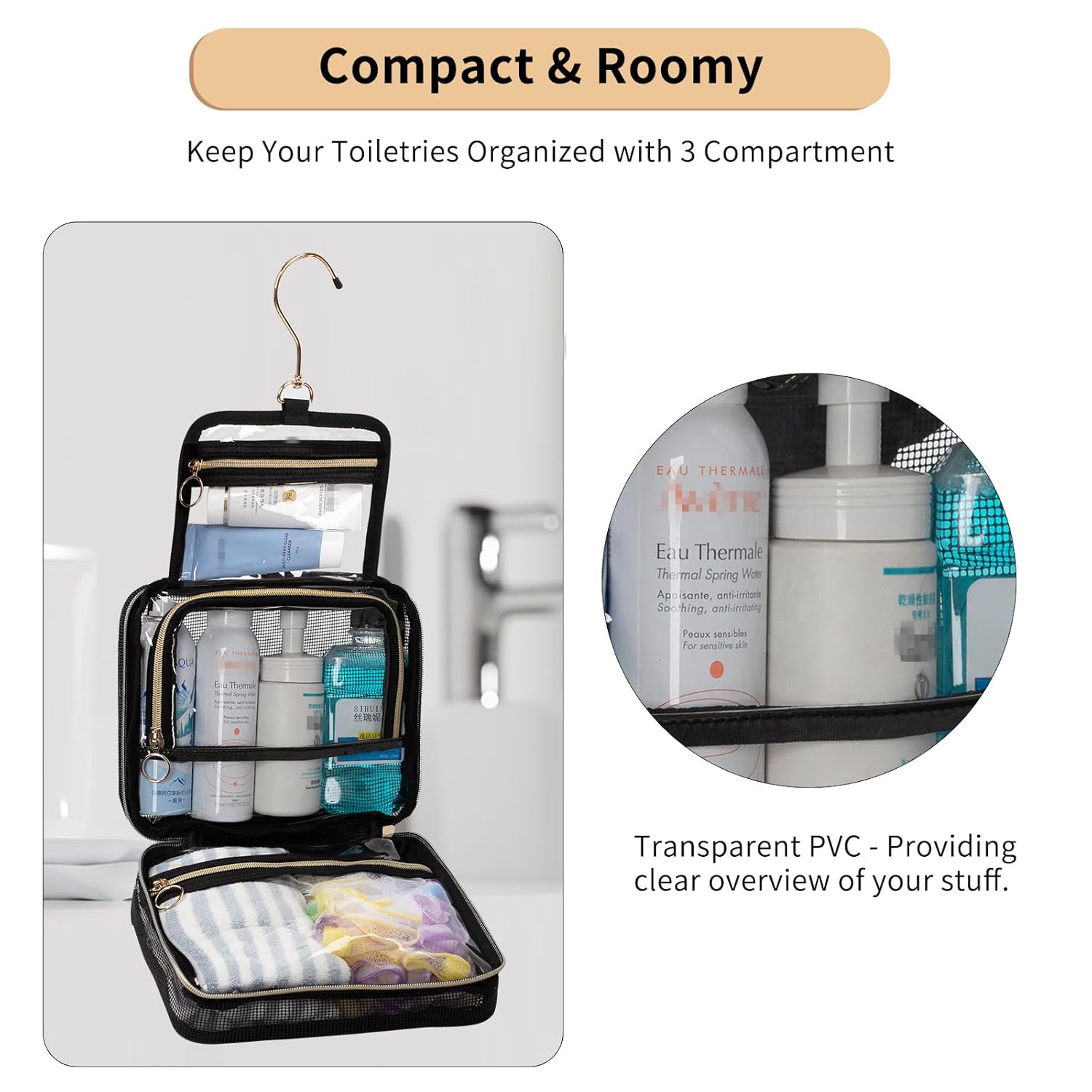 - 3 Separate Compartments —— Used to differentiate your toiletries. Large enough to storage your travel size shampoo,conditioner and more. The inner cover is made of transparent material - PVC, providing clear overview of contents.
