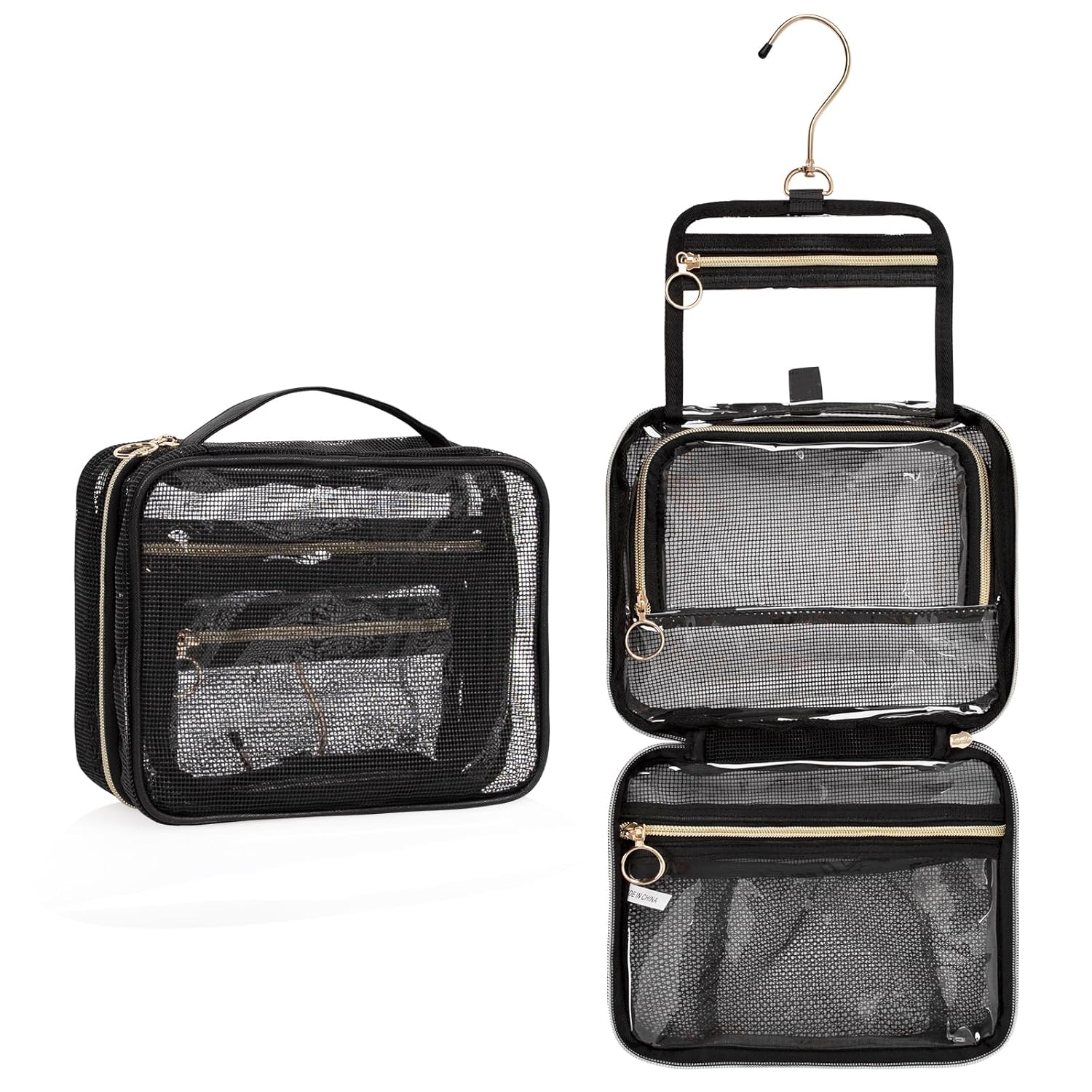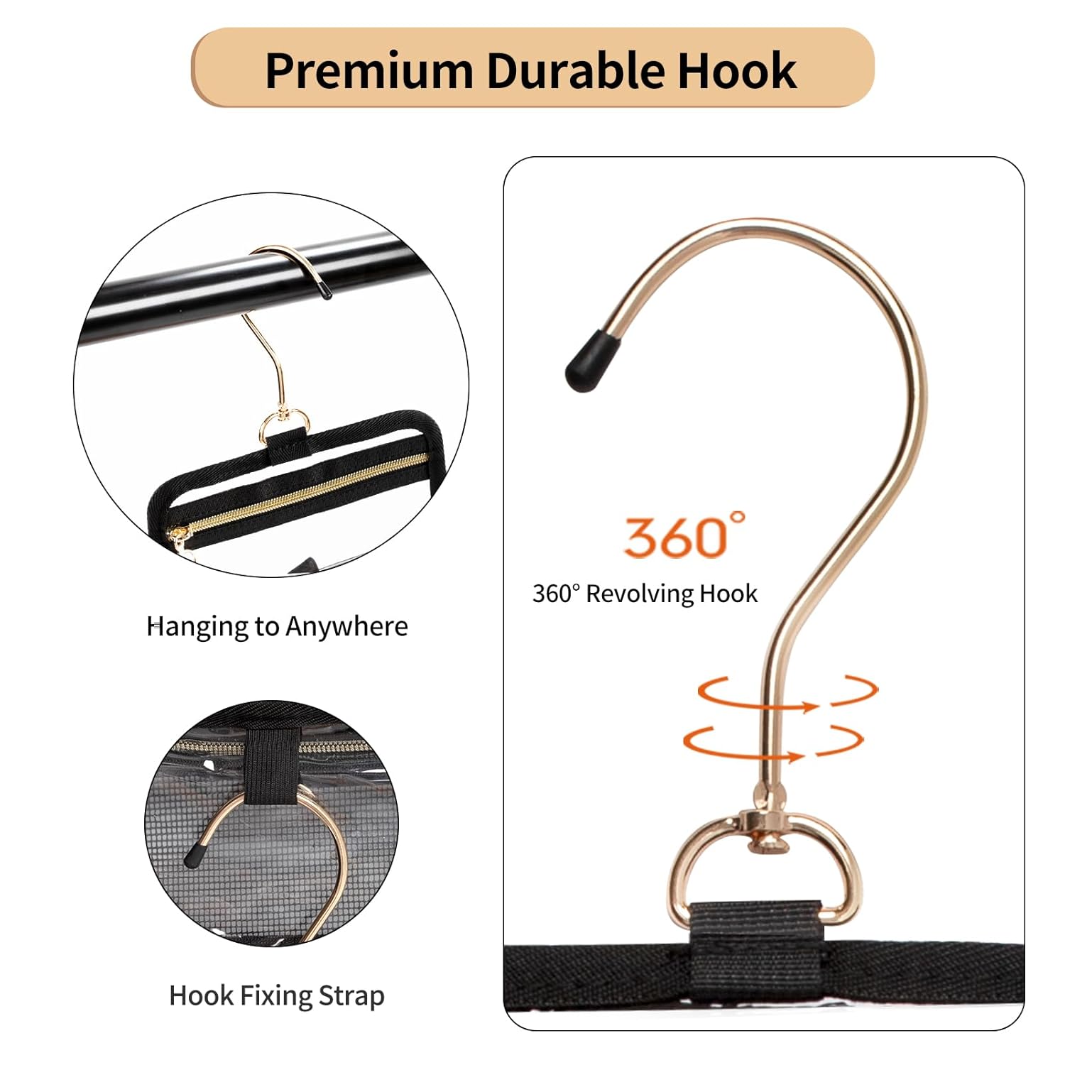 - 360° Metal Hanging Hook —— The hook design allows you to place your toiletries in a room that without enough space. Hanging the toiletry bag to anywhere you want with the 360° large hook. The large hook makes the placing unlimited. You can hang it on the door, wardrobe or shelf or showerhead.