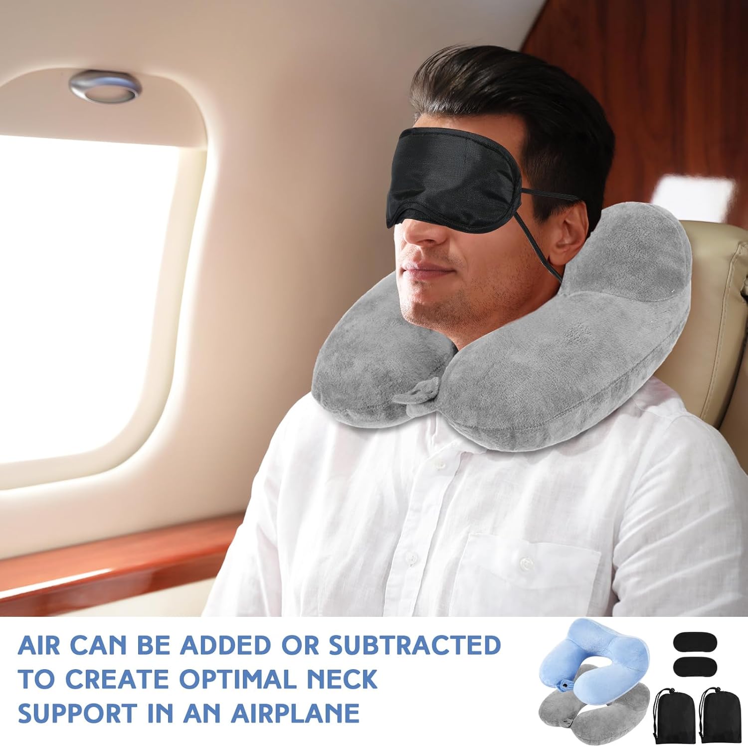 Sintuff 2 Pack Inflatable Travel Pillow for Airplanes Inflatable Neck Flight Pillows with Compact Bag and Blindfold for Traveling, Airplane, Train, Car, Office(Light Gray and Sky Blue)