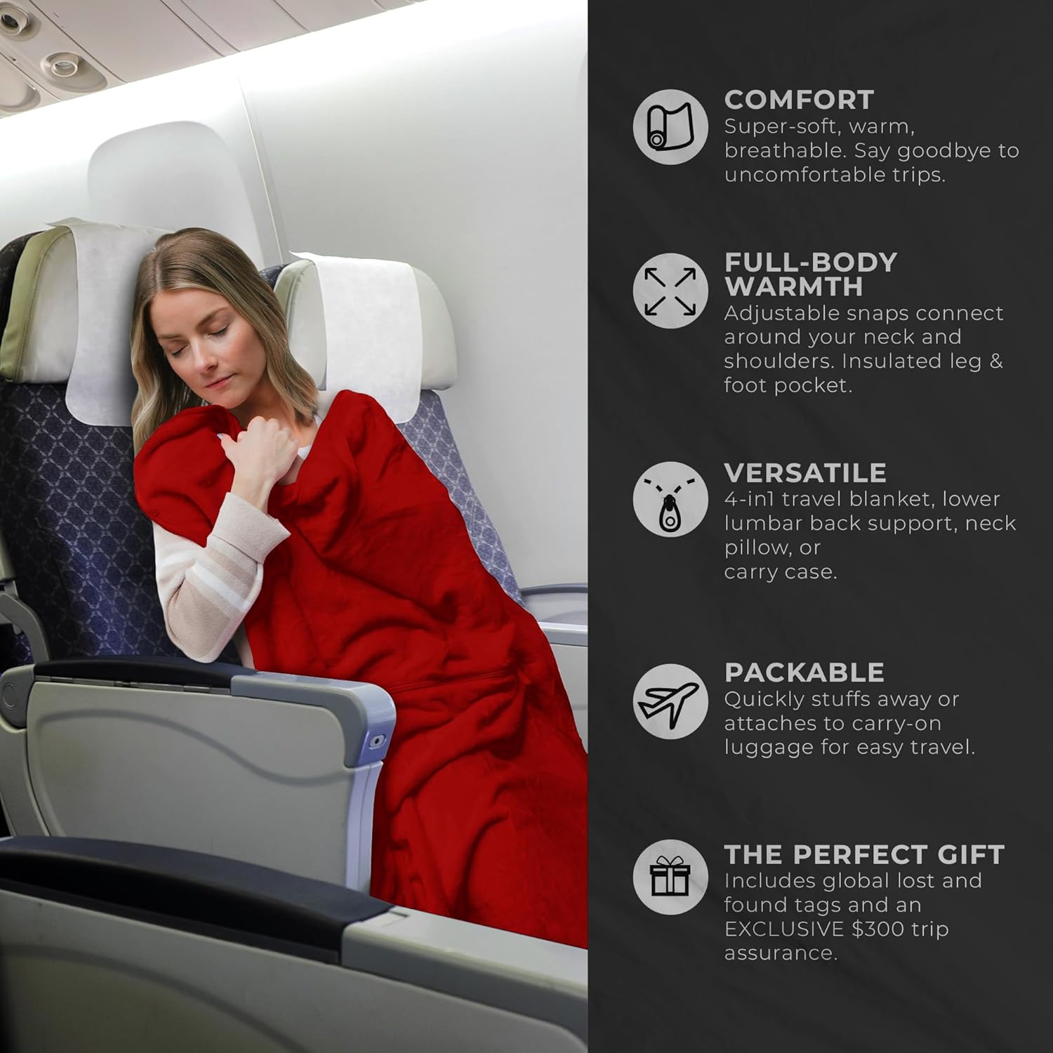Lightweight Travel Blanket - Premium & Compact Airplane Wearable Blanket with Neck Snaps, Cozy Foot Pockets, Zipper Pouch - Converts into Soft Pillow - Designed for Ultimate Comfort - Scarlet