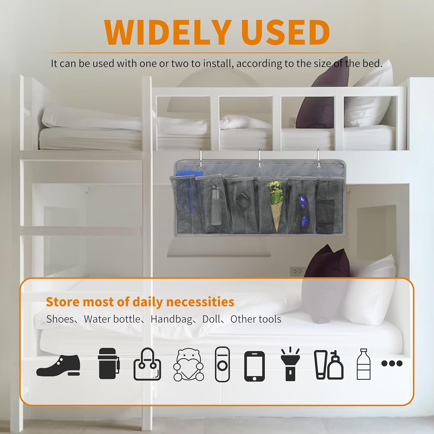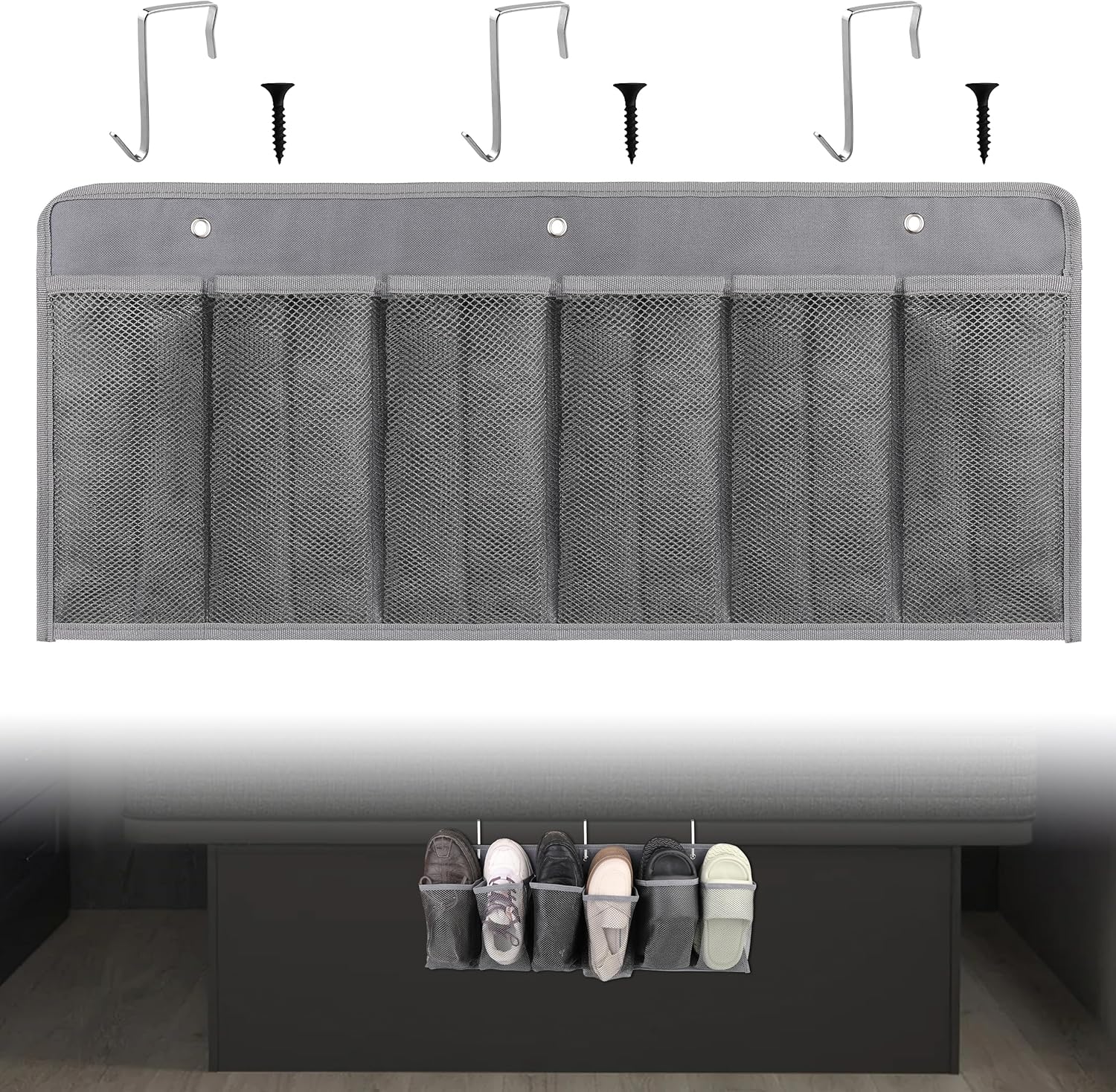 - EASY TO INSTALL: Equipped with 3 hooks and 3 screws, you can hang the shoe organizer on the bed frame or use screws to fix it, save your space, and can be folded when not used