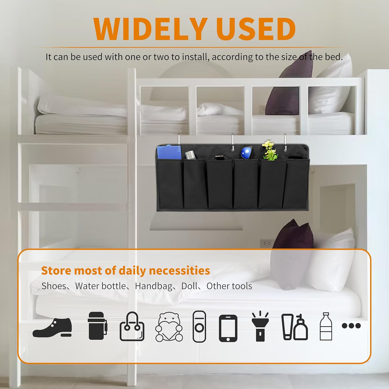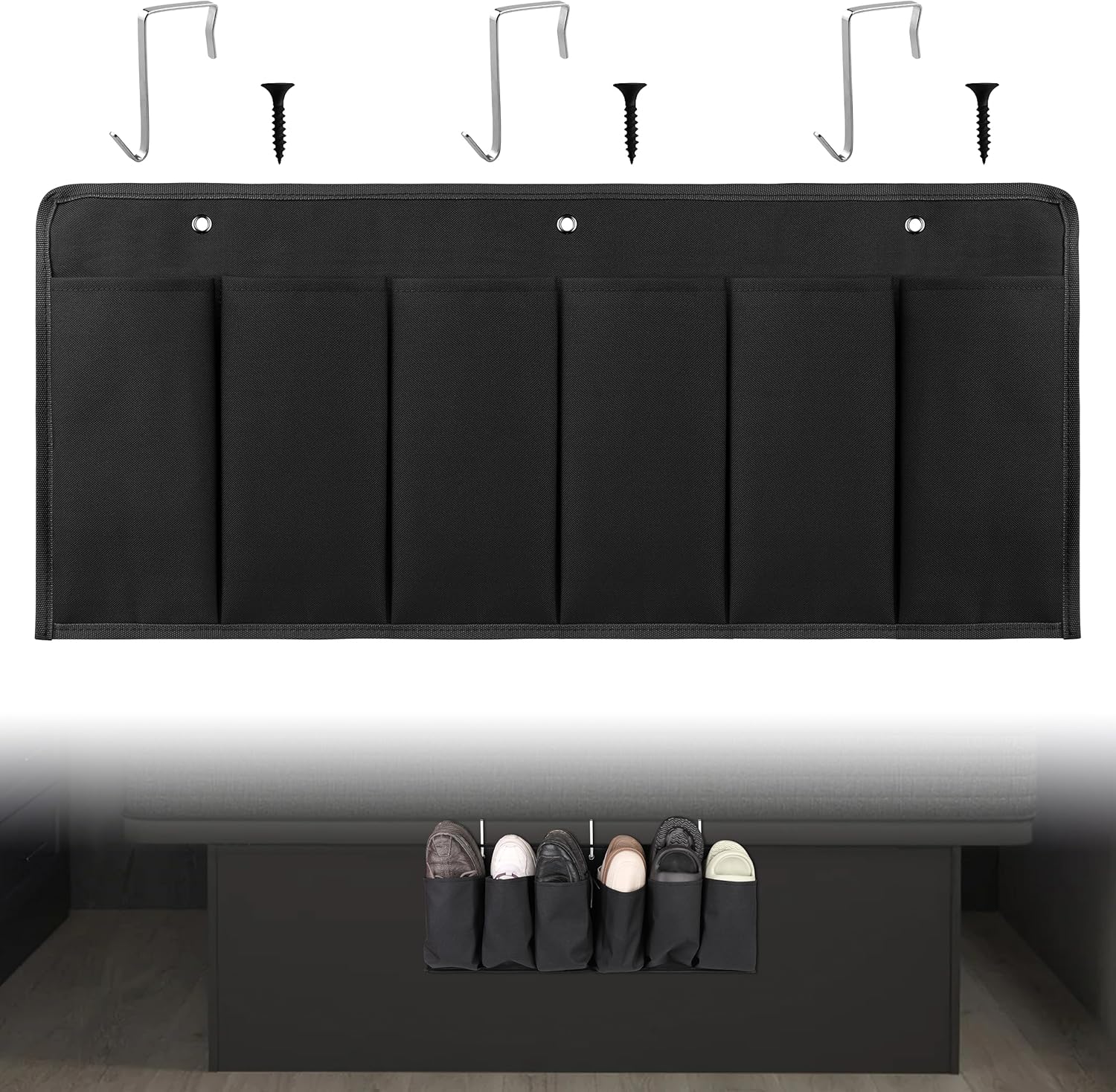 - EASY TO INSTALL: Equipped with 3 hooks and 3 screws, you can hang the shoe organizer on the bed frame or use screws to fix it, save your space, and can be folded when not used