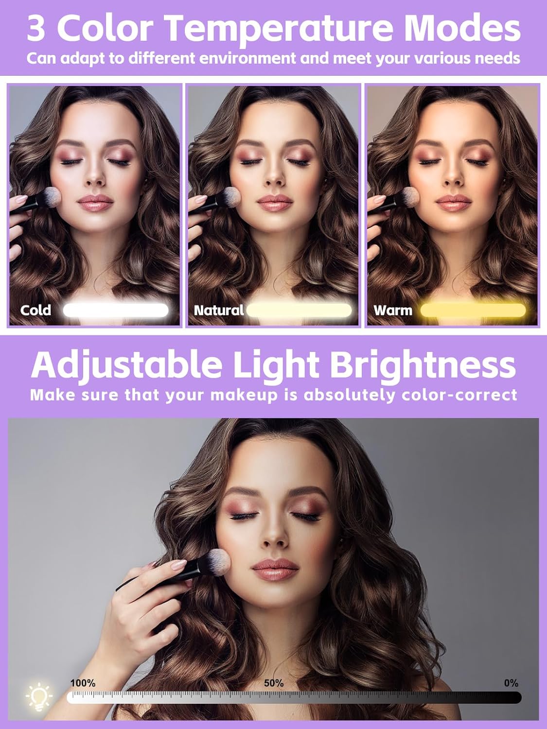 - 💄【4K Mirror with 3 Color Lights】Kalolary cosmetic case features with a 4k full-screen light mirror, which has 3 adjustable color light, gently touch the switch can easily adjust the color temperature between cold light, natural light and warm light, long press can adjust light brightness from 10% to 100%, giving you color-corrected, flawless makeup application every time. And the mirror angle is also adjustable allows multiple angle for your convenience.