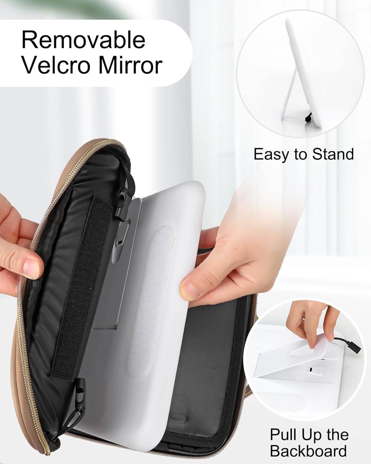 - High Frame Protect the Mirror: The makeup bag with mirror design with a high frame which is higher than the other makeup bags with mirror of more than 1 inch, effect to provides enough storage space for the mirror. The back of the makeup brush compartment has a thick sponge to protect the mirror when closed, not easy to break when traveling.