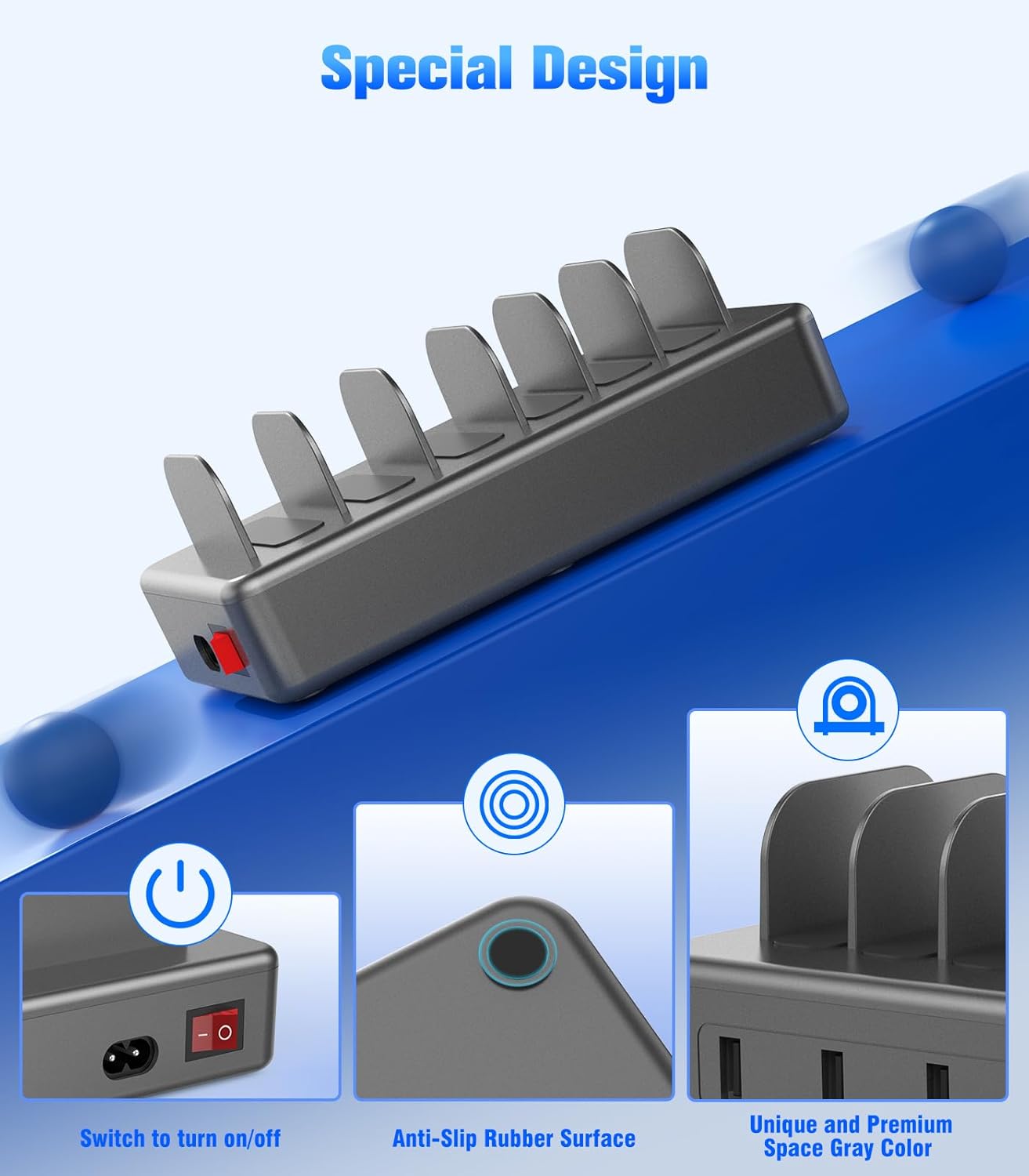 - 【Special design】This multi chargers for all devices is unique and premium space gray color.The six slots of the charging dock have silicone pads to prevent devices from sliding. With three slots that are 0.75 inches and the remaining three slots that are 1 inch, as well as 1.3-inch high dividers, they are all wide and sturdy enough to conveniently hold your multi-devices