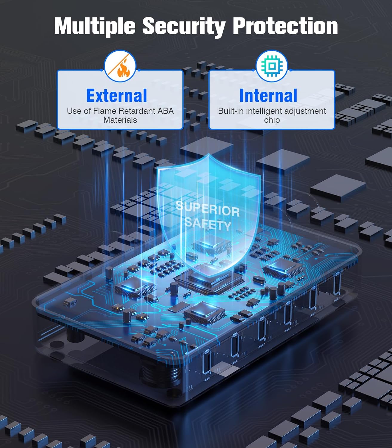 - 【Multi-Security Protection】The power adapter is UL, CE, FCC, and RoHS certified, ensuring that your devices meet the highest safety standards. The multiple charging station is made of high-quality flame-retardant ABS material, providing excellent safety and protection. The smart chip inside the charging station automatically cuts off power when the temperature is too high, offering short circuit, overheating, and overcharging protection