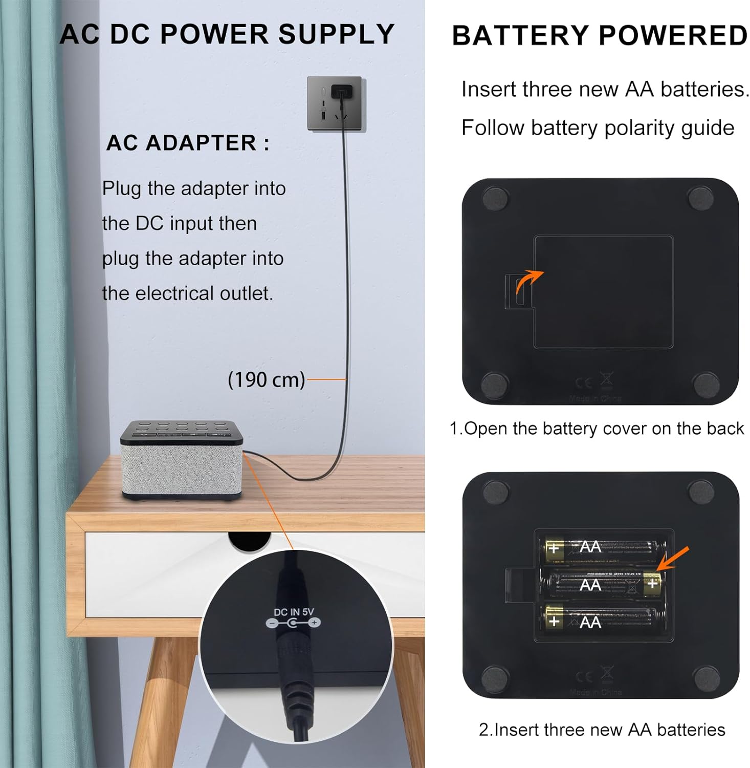 - [Plug in or Use battery for White Sounds Machine] β The sleep noise machine is powered by an included AC adapter with a micro USB cable or 3 AA batteries (Not included), making it an easy portable solution for home, office and travel.