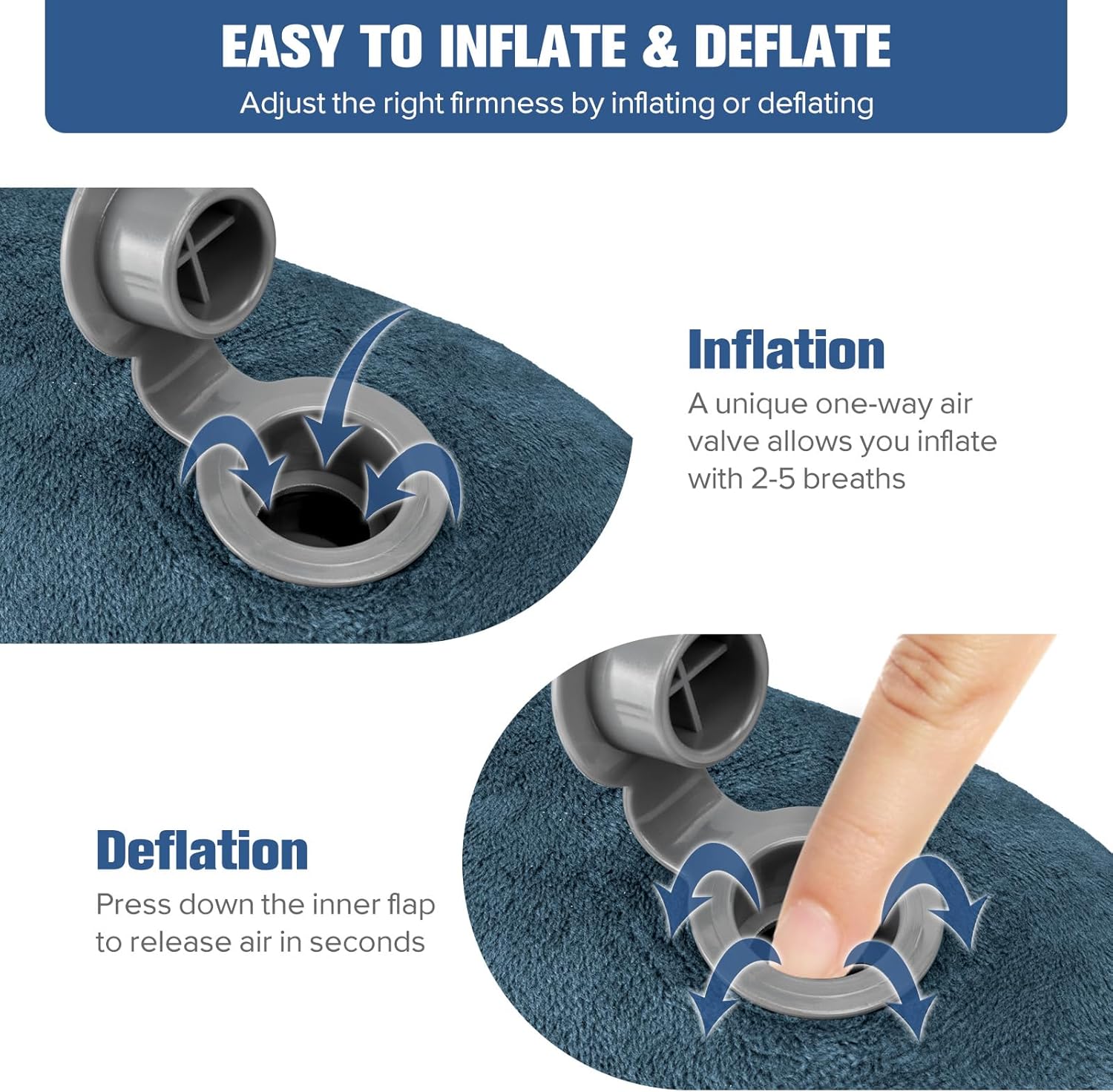- ✈Easy to Inflate & Deflate: A unique one-way air valve allows you to inflate it in seconds. The blow up travel pillow easily deflates by pressing down the inner flap and pushing the air out. Adjusting the firmness of the pillow was also just a matter of letting some air out or adding air.
