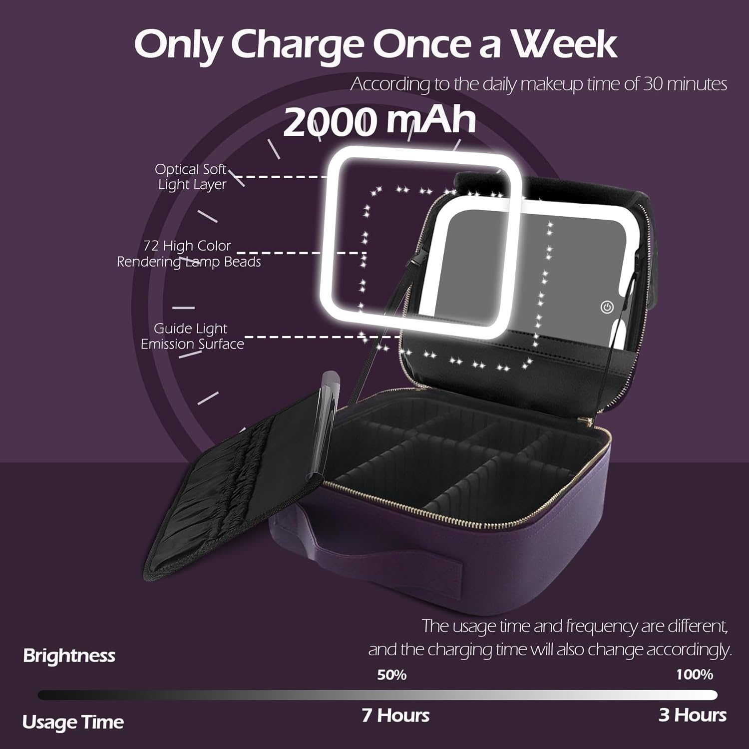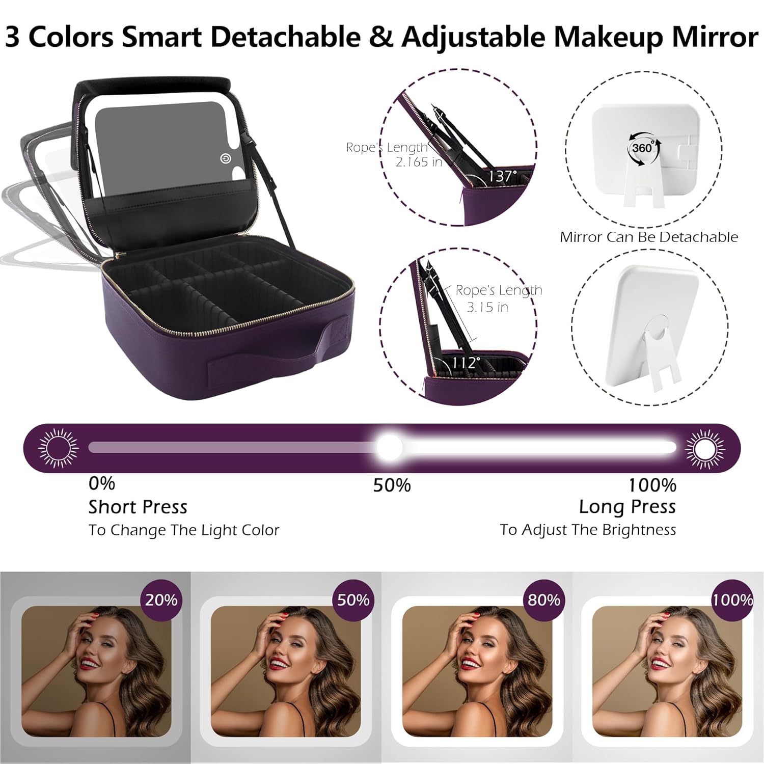 MOMIRA Travel Makeup Bag Cosmetic Bag with Lighted Mirror, Adjustable Brightness in 3 Color Scenarios, Waterproof, 10x Magnifying Mirror, Rotatable Independent Light Mirror- Deep purple (Solid)
