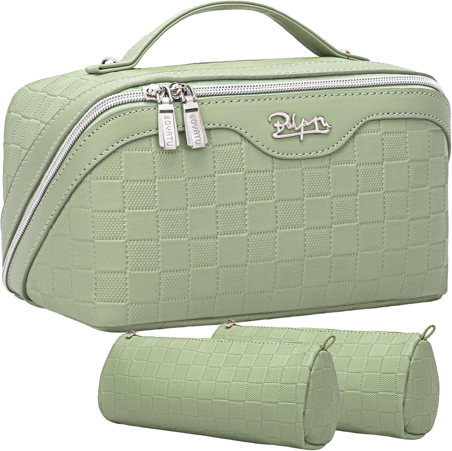 Travel Makeup Bag Organizer Cosmetic Bag: 3 Pcs Set Make up Bags for Women with Handle - Waterproof Vegan Leather Toiletry Bags with Comparments (C-06-Green)