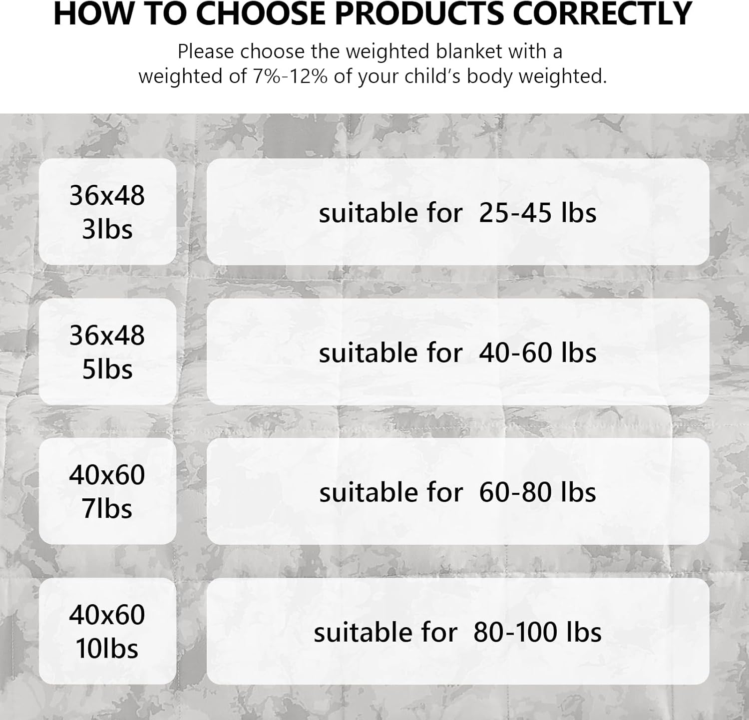 - Recommended Weight Size: Please choose 7%-12% of your body weight which would help you sleep better. We recommend 48''x72'' for twin bed, 60''x80'' for queen bed. This weighted throw blanket can be used while sleeping, reading, relaxing, or meditating