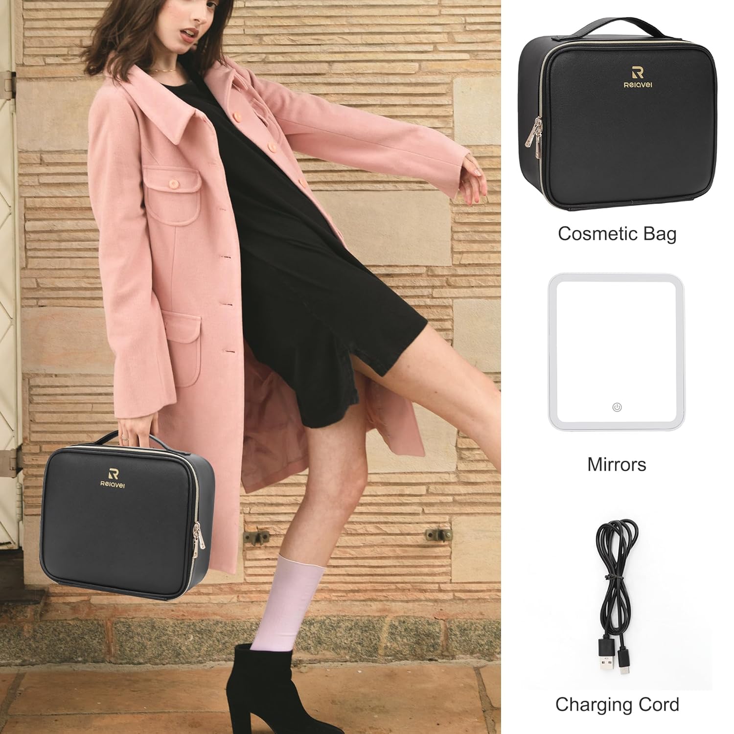 Relavel Travel Makeup Bag With LED Mirror, Cosmetic Train Case with Light up Mirror, Portable Makeup Artist Organizer Bag with Adjustable Dividers, Makeup Brush Holder Storage, Black