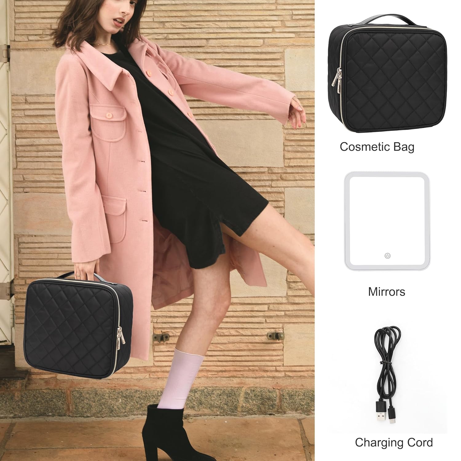 Relavel Travel Makeup Bag With Light Up Mirror, Cosmetic Train Case with LED Mirror, Professional Makeup Case for Makeup Artist, Waterproof Makeup Brush Holder Organizer Storage, Rhombus Black