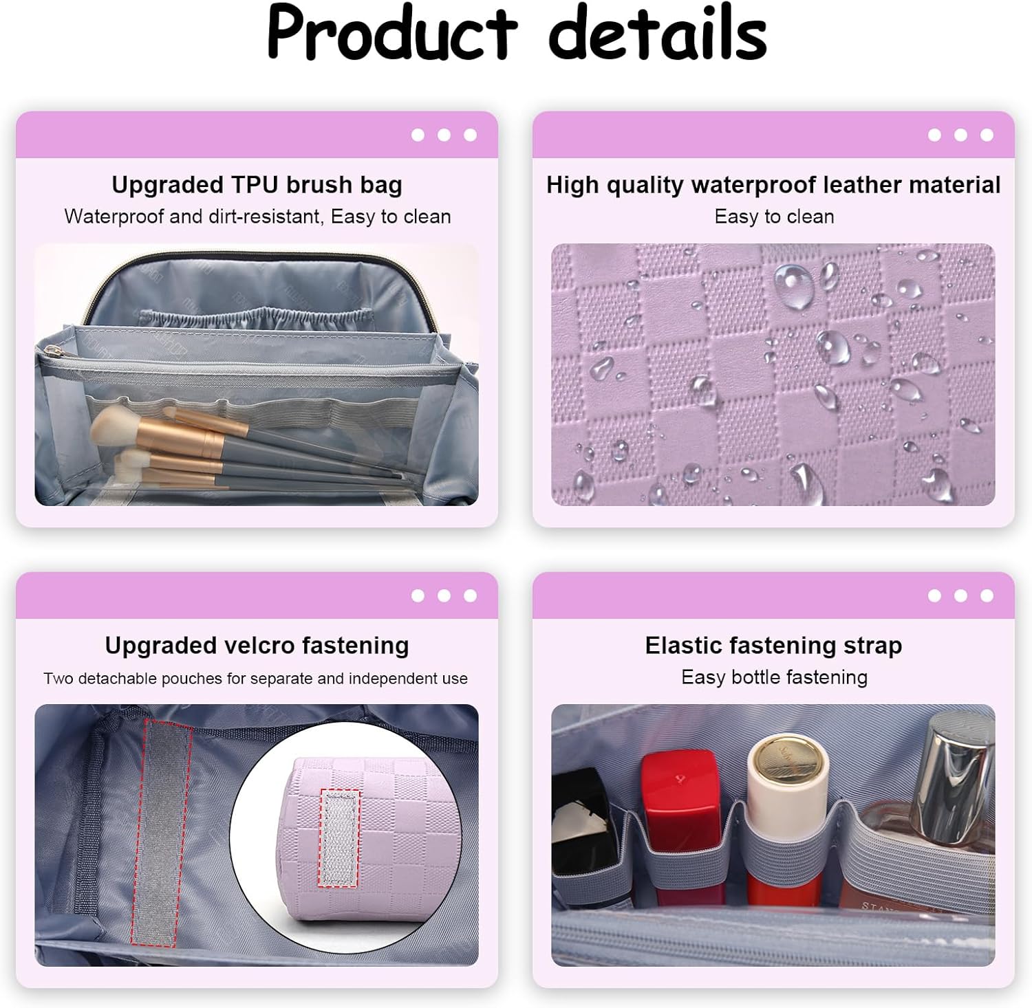 Travel Makeup Bag Organizer Cosmetic Bag: 3 Pcs Set Make up Bags for Women with Handle - Waterproof Vegan Leather Toiletry Bags with Comparments (C-01-Purple)