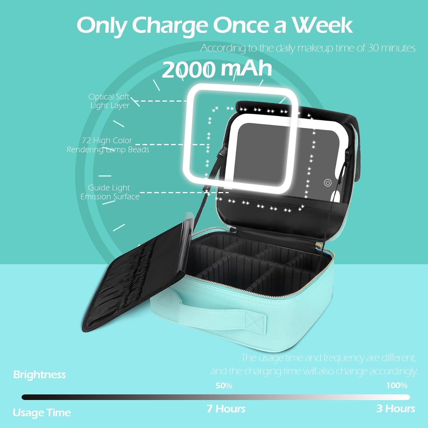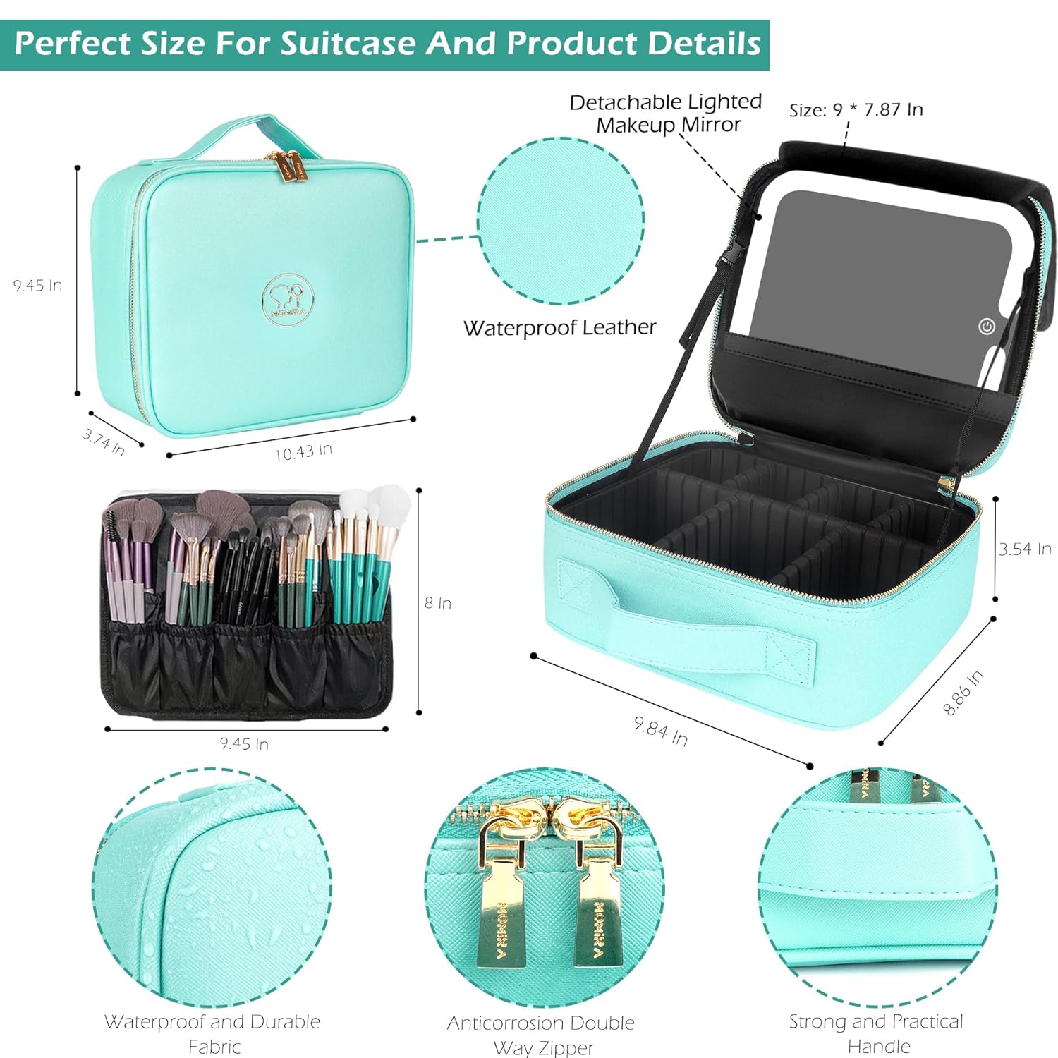 MOMIRA Travel Makeup Bag Cosmetic Bag Makeup Organizer Bag with Lighted Mirror, Adjustable Brightness in 3 Color Scenarios, Waterproof Makeup Train Case, Gift for Women - Aqua Blue