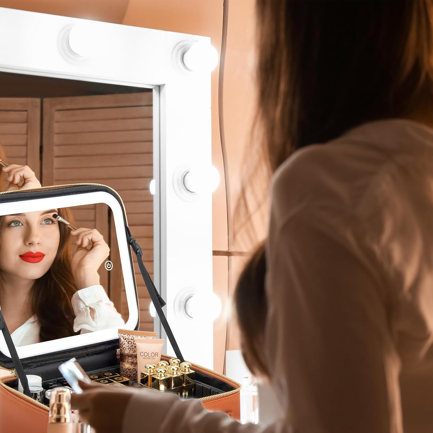 Makeup Travel Train Case with Mirror LED Light 3 Adjustable Brightness Large Cosmetic Bag Portable Storage Adjustable Partition Waterproof Makeup Brushes Make up Jewelry Gift for Women